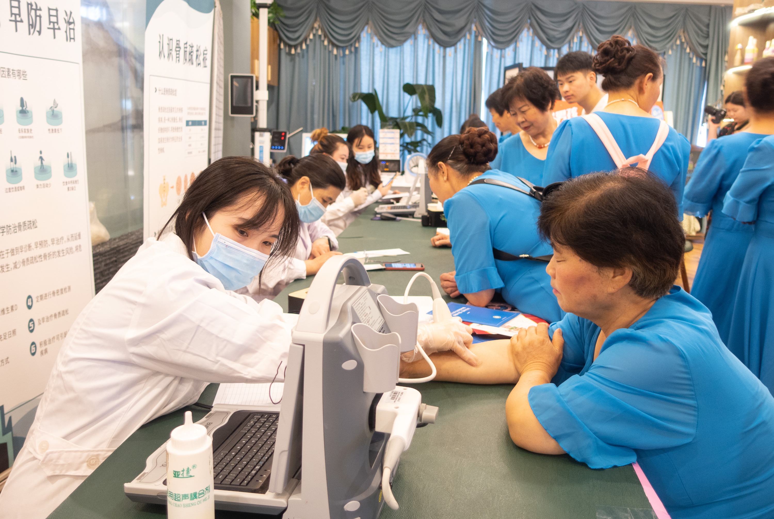 在本次活动中,国药控股贵州骨科器械有限公司提供了两台超声波骨密度检测仪,由贵州省营养学会的营养师和医学助理利用仪器给老年朋友们做了骨密度测试,并由宋红教授和周小萍教授给大家仔细分析测试结果,提出严谨的就诊指导与合理的营养调理建议。