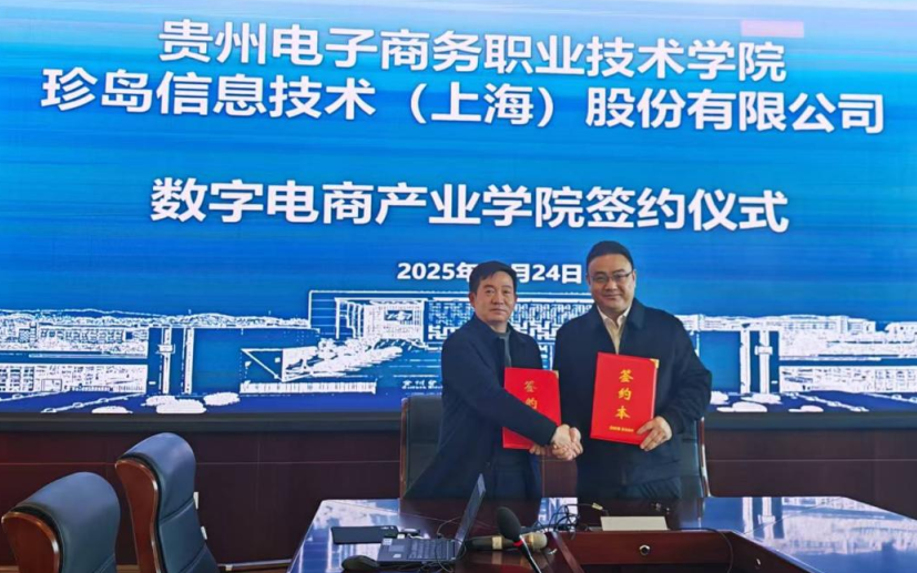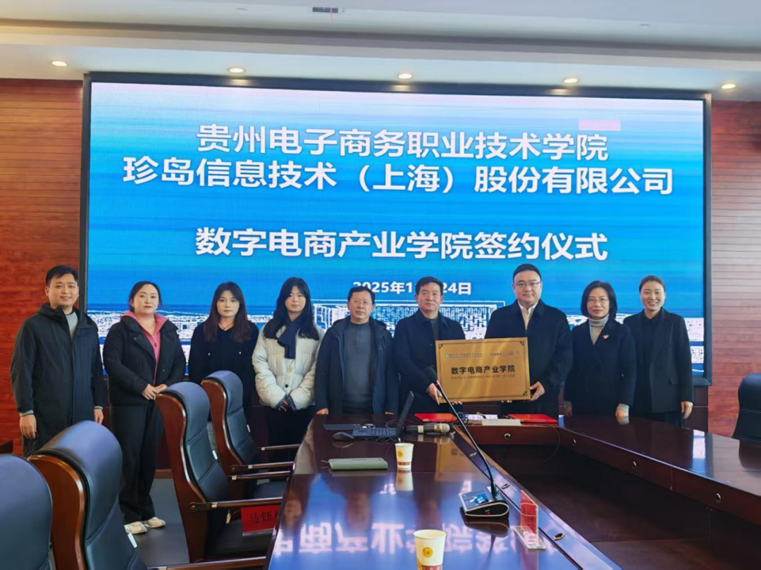 2025年11月24日,贵州电子商务职业技术学院与珍岛信息技术(上海)股份有限公司(以下简称“珍岛集团”)在学院704会议室举行数字电商产业学院签约揭牌仪式。学院党委副书记、院长杨昌顺,电子商务系党总支书记邹江勇,电子商务系主任唐莉莉,珍岛集团院校事业部总经理李罡、院校西南大区总监罗华等校企师生代表共同见证了这一时刻。此次合作是双方响应国家职业教育改革号召、助力贵州“数字经济发展创新区”建设的重要举措,标志着校企协同育人、产教深度融合迈入新阶段。