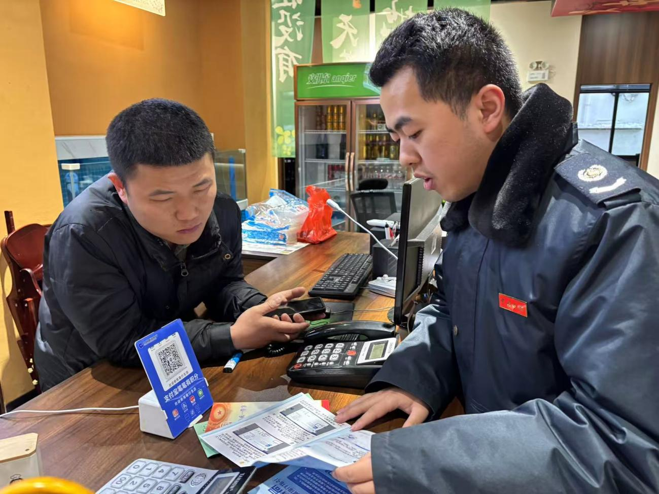 (图为税务干部龙灯会前到丁肥子餐馆进行宣传辅导 摄影:王秋华)