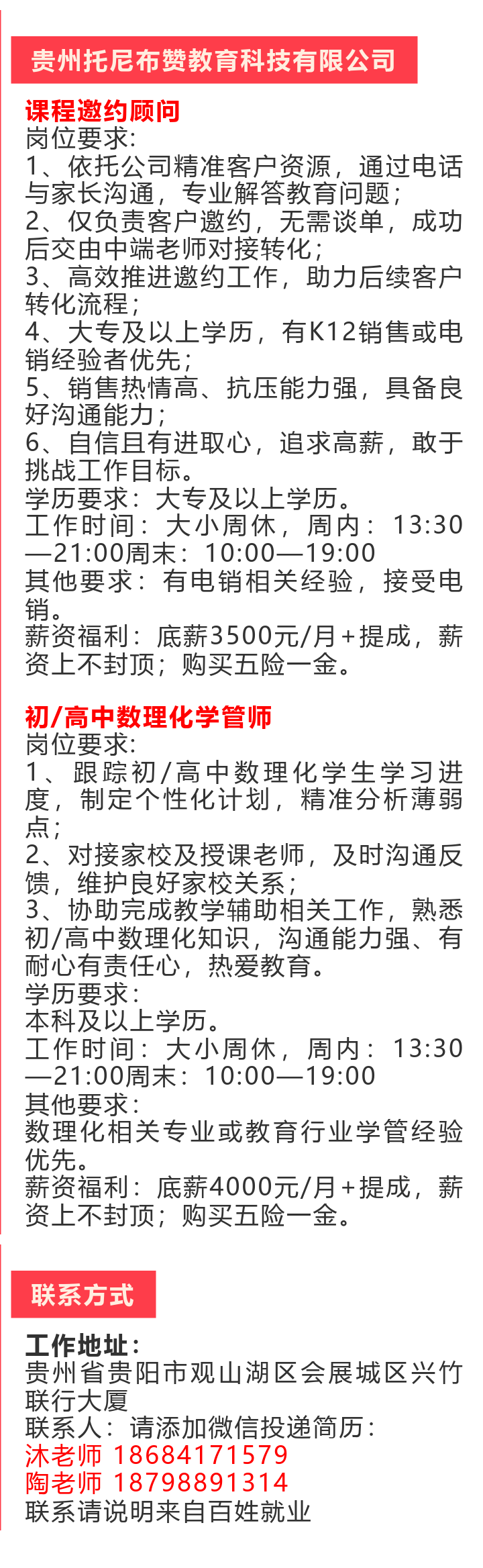 贵阳市观山湖区招聘!底薪3500元~4000元!五险一金!