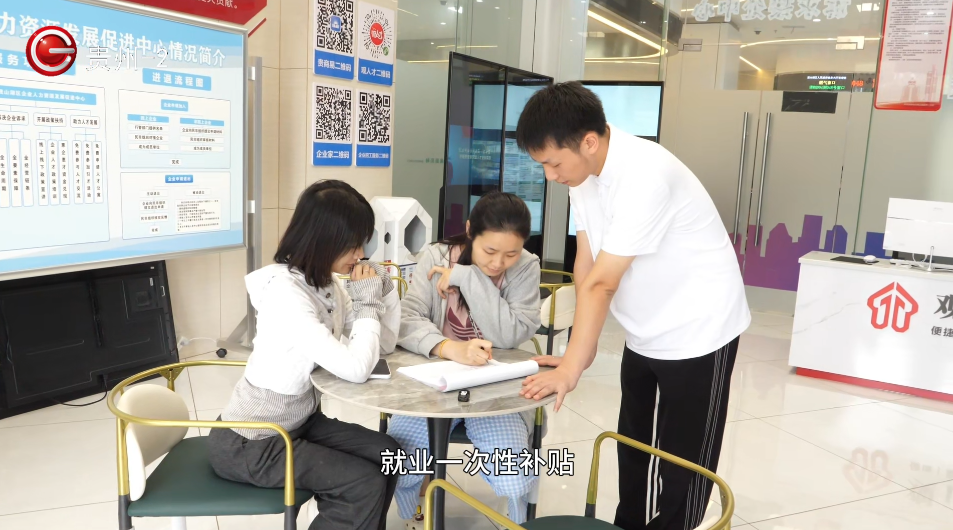 观山湖区零工市场工作人员庞嫡嫡:这个大屏主要用于宣传最新政策,内容涵盖国家针对实习生、招聘服务、小微企业贷款保险以及人才奖励等方面的措施。政策会随时间调整,我们会实时更新。例如现阶段,实习生或见习生可享受每月约2500元的实习补贴;此外,符合条件的本科生和研究生还可申请就业一次性补贴,本科生为1500元,研究生为3000元。