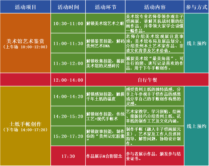 关注“贵州美术馆”微信公众号,进入公众号通过“活动讲座预约”,找到“【大美非遗 传承开新】秋风入怀·觅纸山河|贵州土纸手帐创作暑期研学体验营之走进丰子恺的抗战岁月”,找到对应活动场次,填报个人信息进行预约。