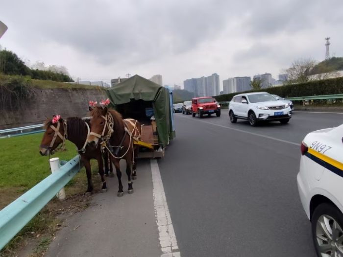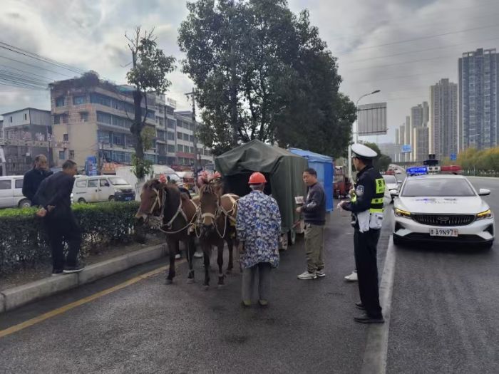 11月12日上午09时20分,观山湖区公安交管分局指挥中心发现贵遵路有一人员驾乘马车,因该路段为城市快速道路,正值早高峰,车流量大,随即调度就近警力前往查看情况。