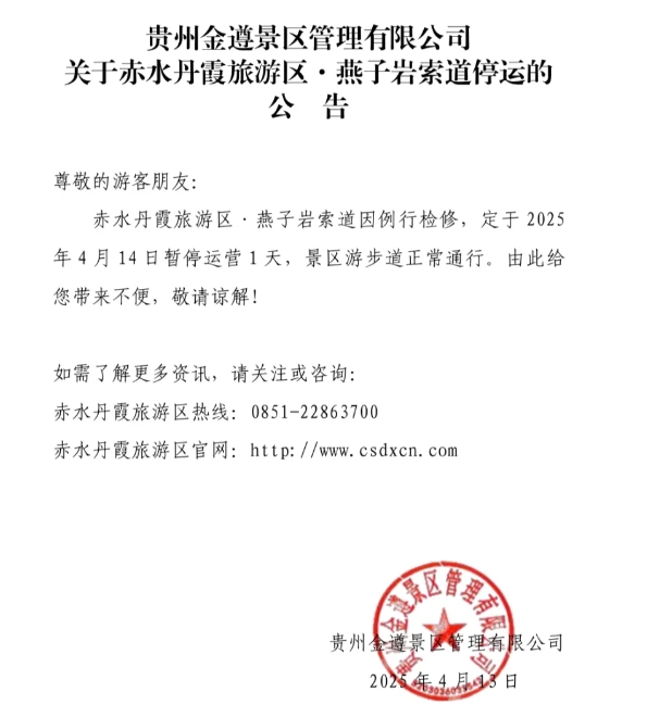 4月14日,赤水丹霞旅游区•燕子岩索道停运