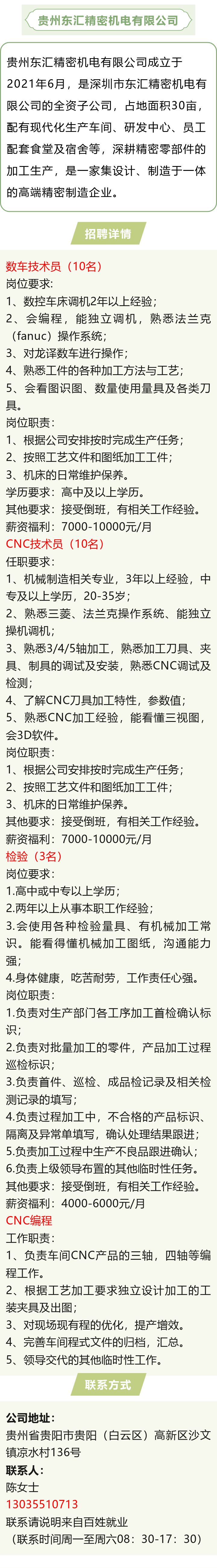 贵州东汇精密机电有限公司多岗招聘!月薪4000~10000元!