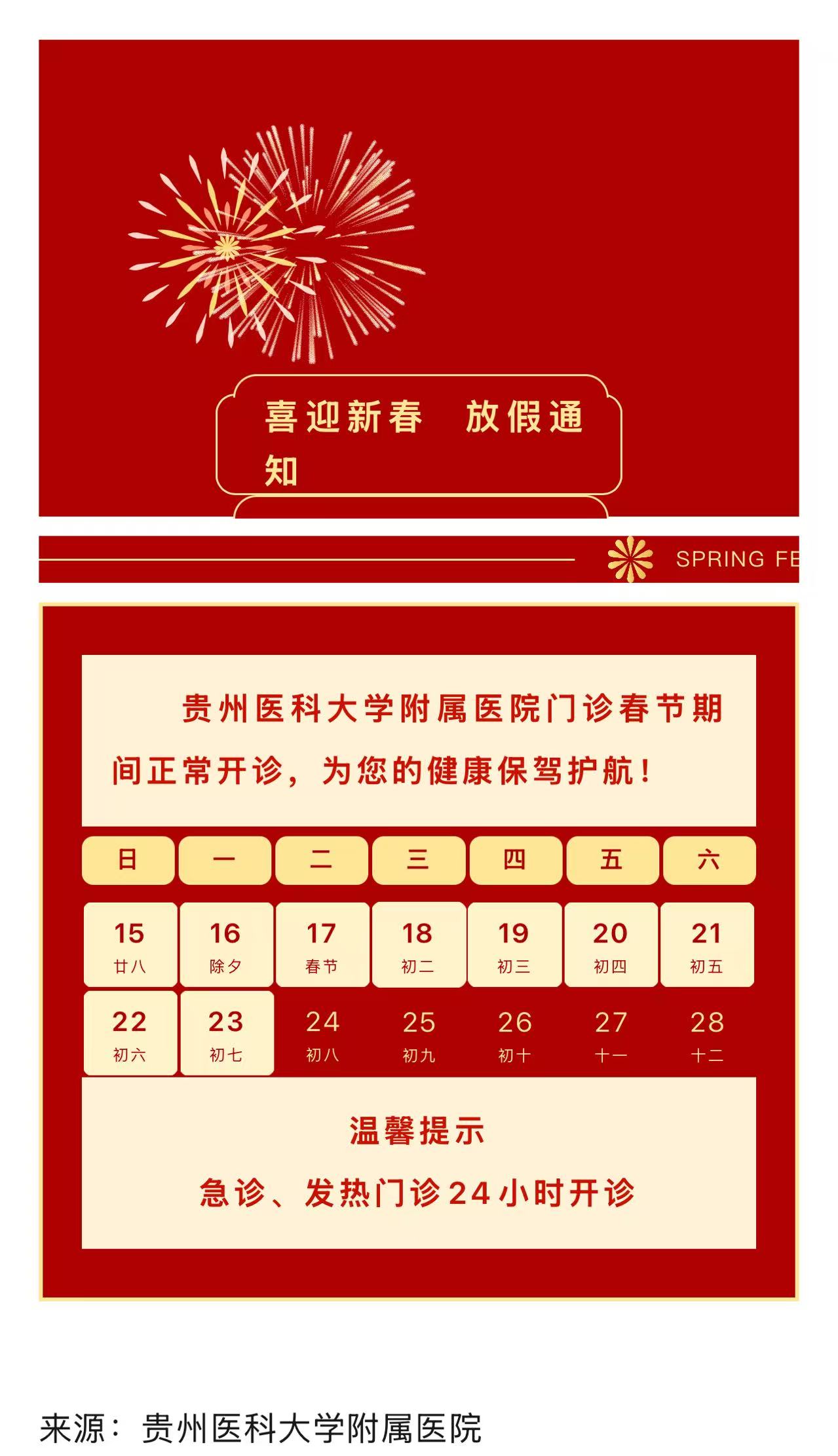 贵州医科大学附属医院门诊春节期间正常开诊!