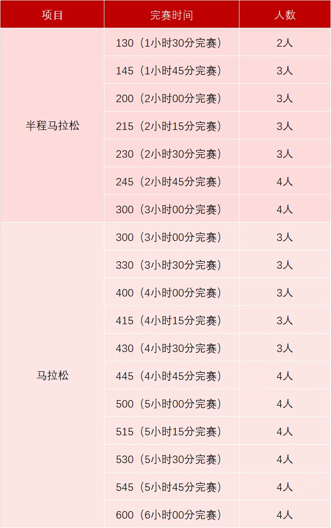 4. 要求具备2年内3场以上马拉松、半程马拉松比赛经历,且至少2次完赛的证书成绩符合申请组别成绩要求(快于申请组别完赛时间30分钟,成绩可视配速段详情减缓),线上马拉松成绩无效;