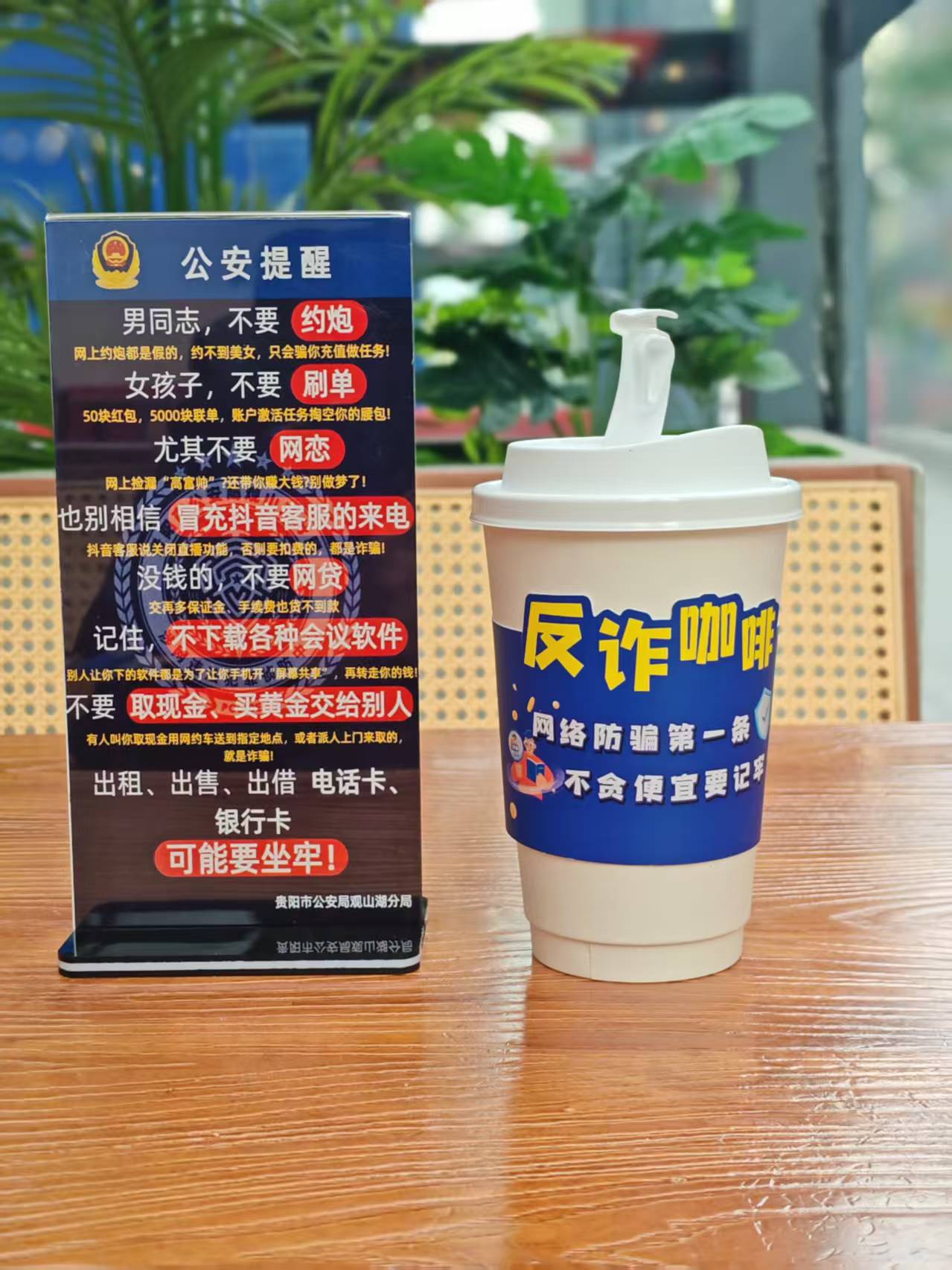近日,贵阳市公安局观山湖分局积极联动辖区企业,深入探索“反诈+”宣传模式,将实用的防骗知识融入“咖啡文化”,巧妙地印在杯套上、桌牌上,让反诈伴随咖啡的香味,自然地流淌进街头巷尾,也走进每个人的生活日常。