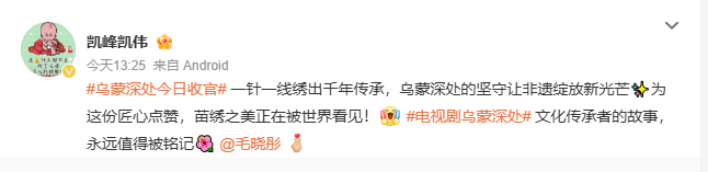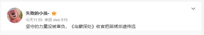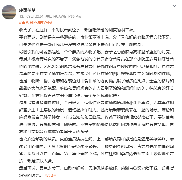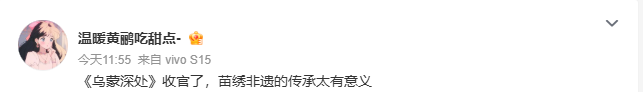 该剧备受广大观众的好评,有的点赞剧中“人美、景美、服饰美”,有的点赞“剧情也太好嗑了”,还有点赞该剧“没有悬浮剧情,只有乌蒙腹地的烟火人间与奋斗微光”。如今该剧迎来收官,观众也表达出依依不舍。