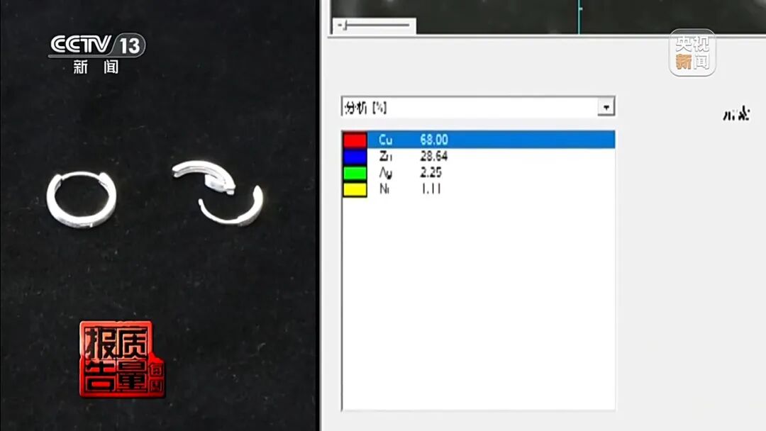 “足银饰品999”直播间宣称“除了银子没有其他杂质”的耳饰,检测发现主体为铜锌合金,实测银含量仅为0.67%。