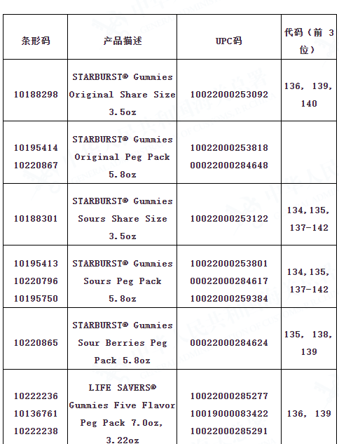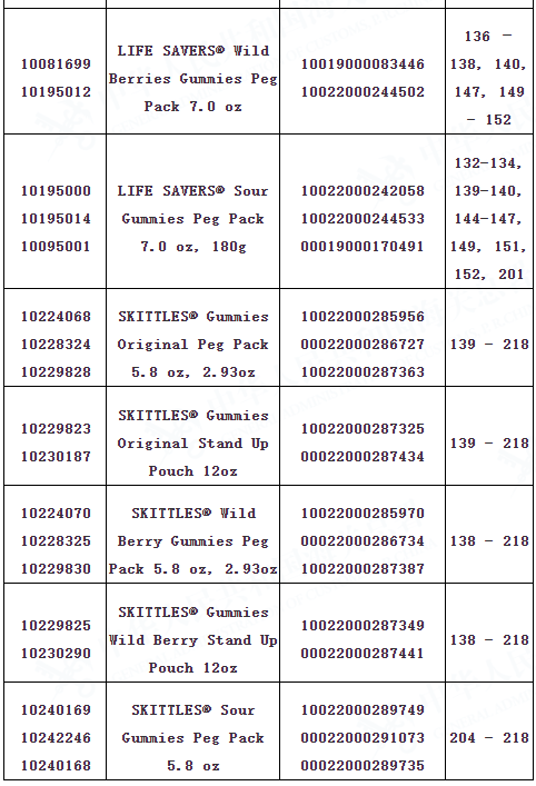 海关总署提醒广大消费者,暂不通过任何渠道购买玛氏箭牌糖果有限公司正在召回特定批次的SKITTLES软糖、STARBURST软糖和LIFE SAVERS软糖产品(具体产品信息请见附表)。