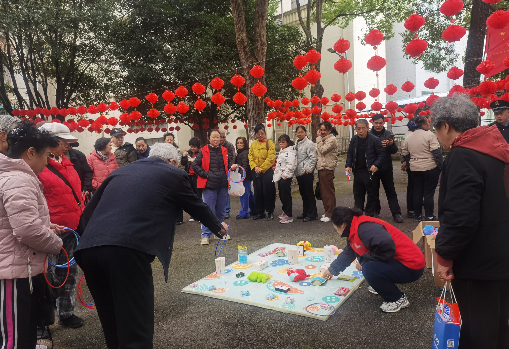 吃完汤圆,还有投壶、套圈等娱乐游戏节目,更是将元宵主题活动气氛推向高潮,游戏场地上整齐摆放着文具、零食、生活用品等礼品,大家各显神通,凭借才艺展示获取套圈机会,精彩表演轮番上阵。参与者手持彩圈瞄准目标,或屏息凝神,或潇洒一掷。游戏不仅考验技巧,更拉近了邻里距离,大家互相加油助威,现场掌声与欢笑声交织成一片。