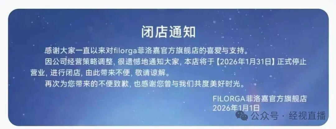 近日,法国院线护肤品牌Filorga菲洛嘉官方旗舰店发布公告称,由于公司经营策略调整,店铺将于2026年1月31日正式停止运营并闭店。
