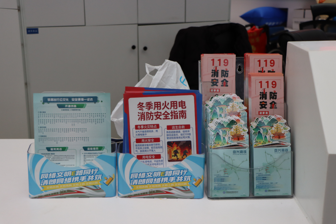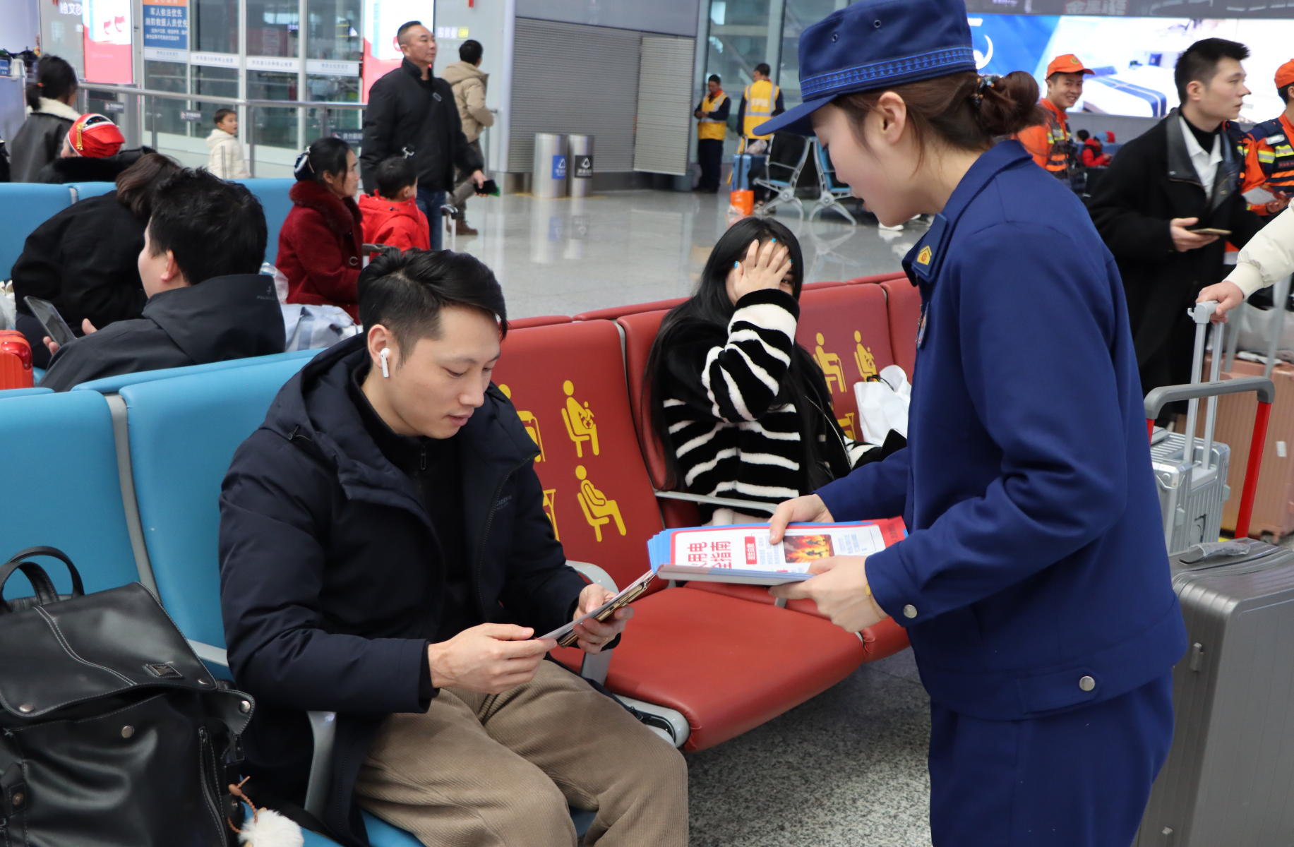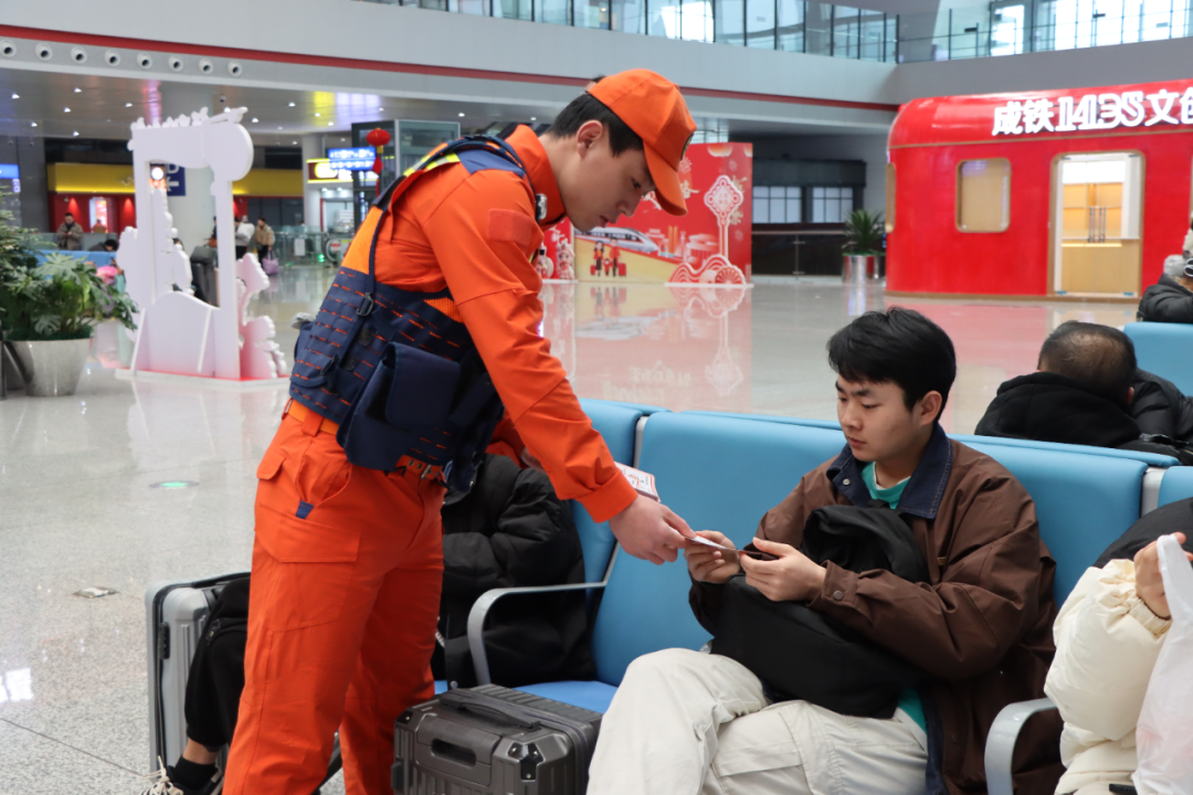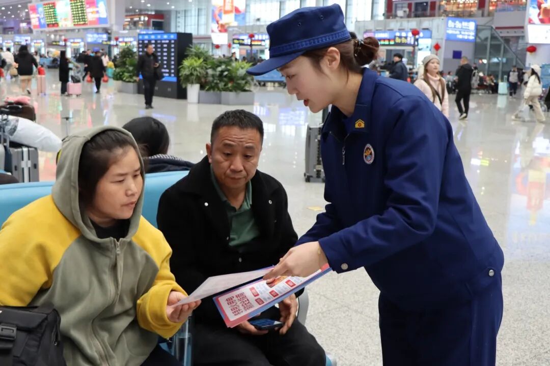宣传员在贵阳北站进站口、候车区、检票口等客流密集区域,向过往旅客发放消防宣传手册,讲解春节出行期间消防安全注意事项,解答旅客关于火灾预防、初期火灾处置等疑问,普及消防安全知识。