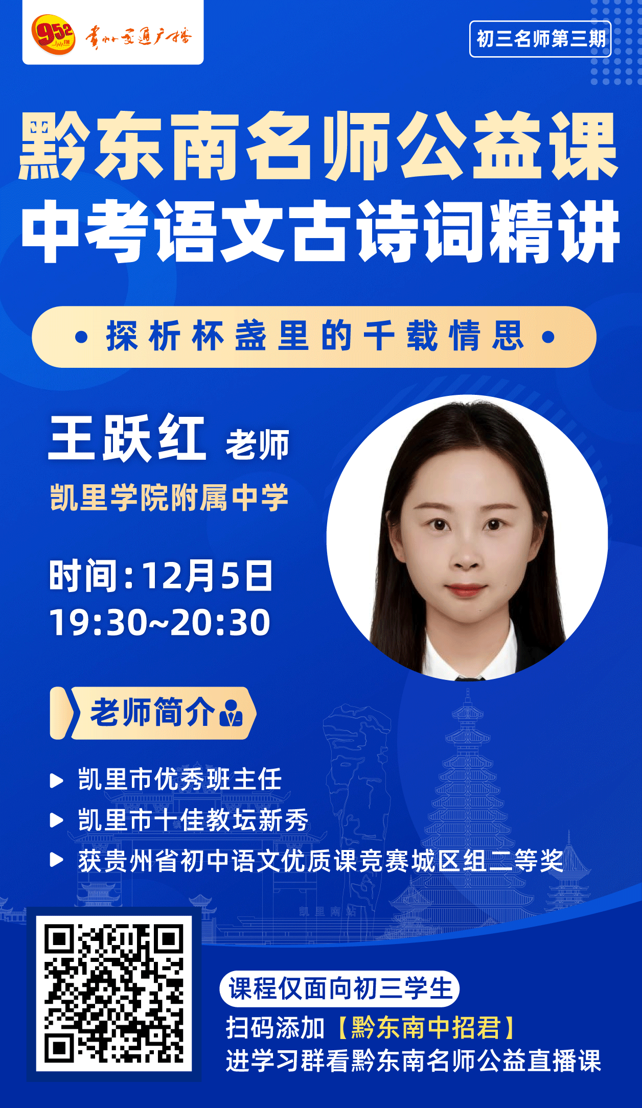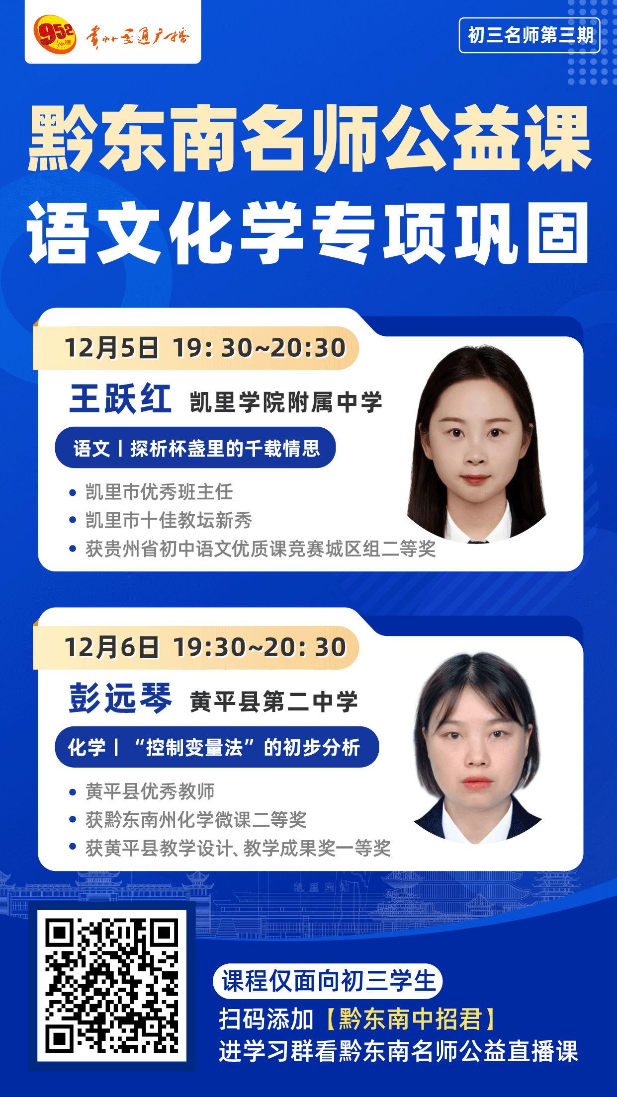 为进一步推动优质教育资源共享,帮助初三学子精准把握中考考点,攻克学科学习难点,贵州广播电视台交通广播持续发力,隆重推出“黔东南名师公益课”初三名师第三期课程,邀请州内优秀教师带来语文、化学两门学科的精品直播教学,为初三学子的中考备考之路保驾护航。
