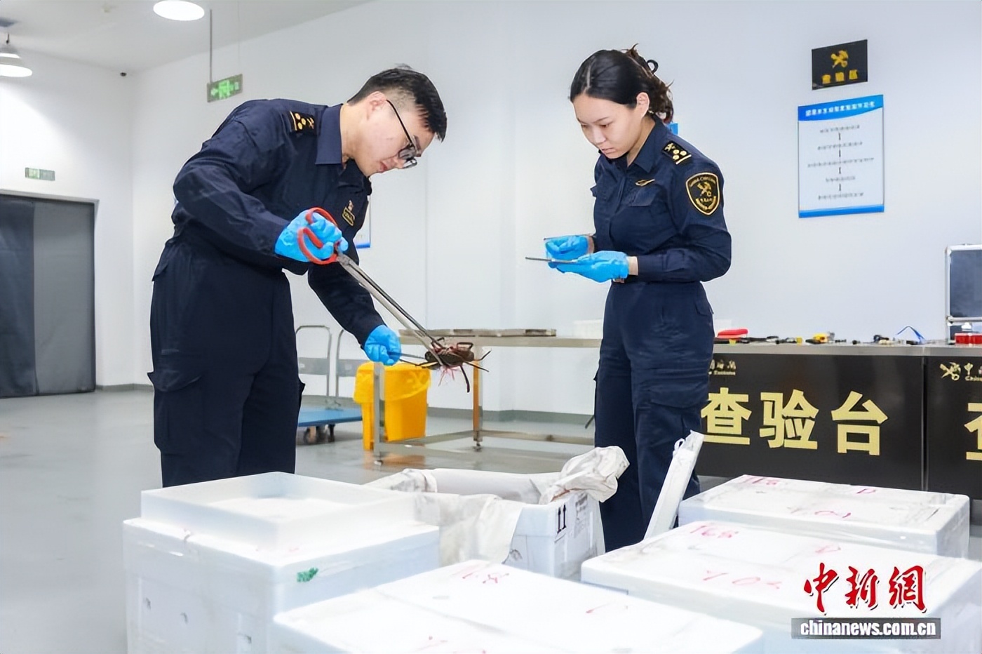 12月10日,一批来自泰国的青蟹搭载HU7940航班抵达海口美兰国际机场。图为美兰机场海关审单及查验现场。 (海口美兰国际机场 供图)