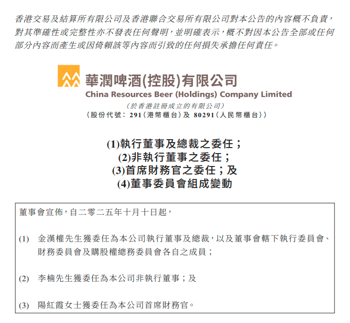 值得关注的是,此次人事变动与华润啤酒日前的高管调整形成呼应。10月10日,华润啤酒公告中提到,华润万家原首席财务官阳红霞(2023年至2025年9月担任华润万家(控股)有限公司首席财务官)转任华润啤酒首席财务官。