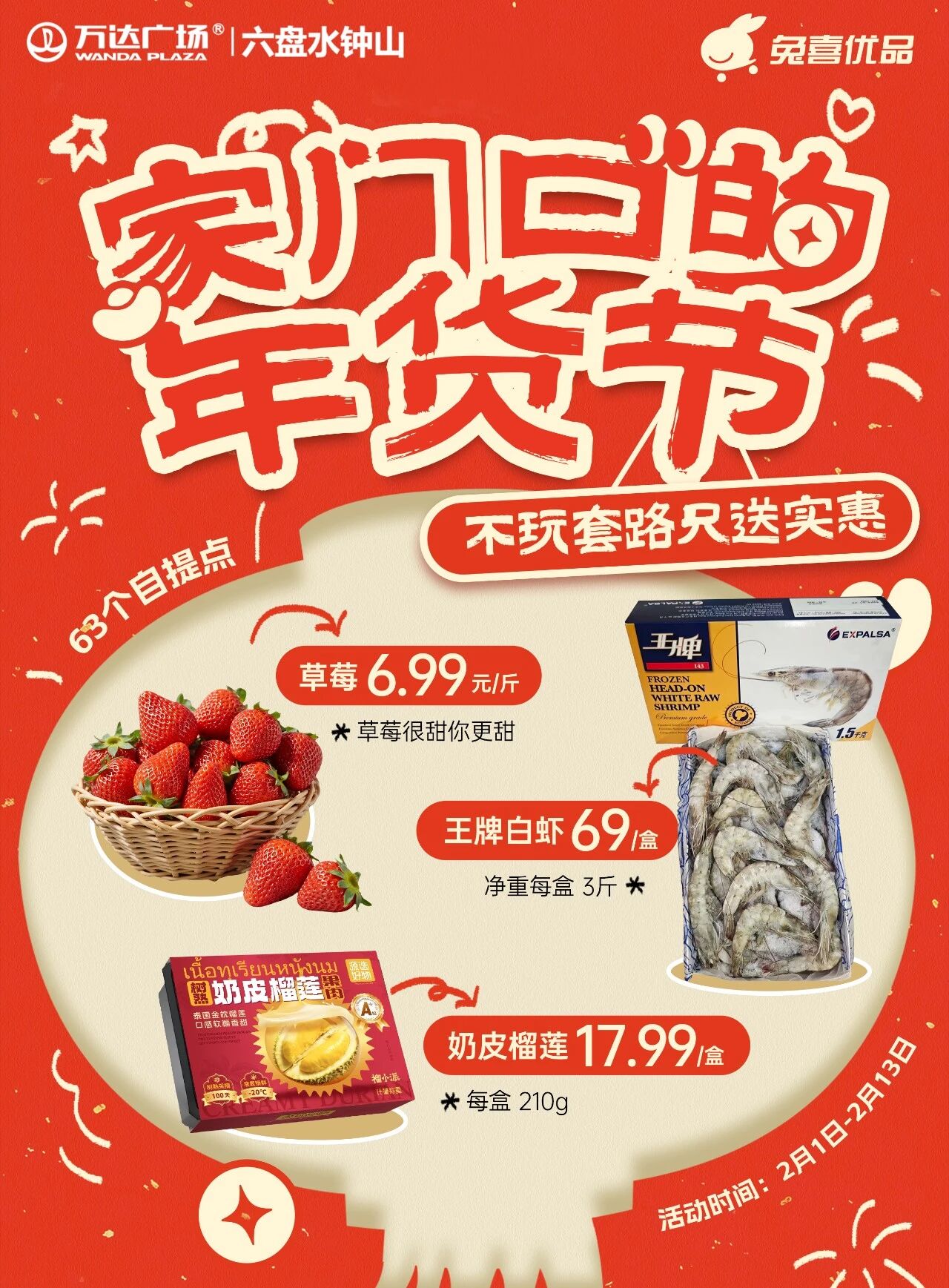 活动内容:打造“年货一条街”,推出多样化套餐产品,包括年夜饭海鲜套餐、年货糖果套餐、年货家清套餐、年货拜年大礼包等,满足市民家庭采购和礼品赠送需求。