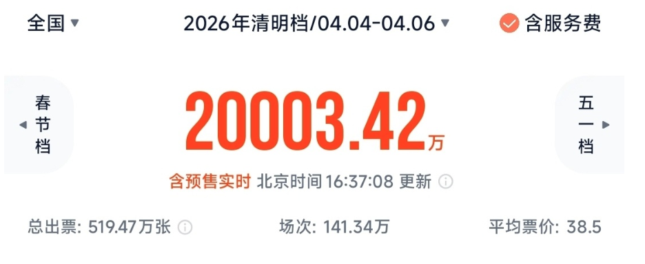 据网络平台数据,截至4月5日16时37分,2026年清明档档期(4月4日—4月6日)电影票房(含预售)突破2亿元。