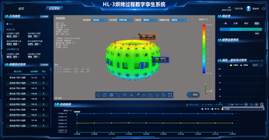 据介绍,真空室烘烤对提供高品质等离子体运行真空环境具有重要意义,数字孪生系统以真空室温度场分布为核心对象,构建了准确的数字化模型,通过接收加热器和实体温度监测点的数据输入,利用虚拟传感器算法,实时输出完整的温度场分布,实现了对真空室内部状态的全方位、高精度监测的实时同步计算与监测,大幅提升了真空室烘烤过程的控制和响应能力。