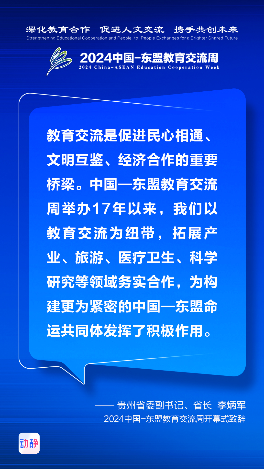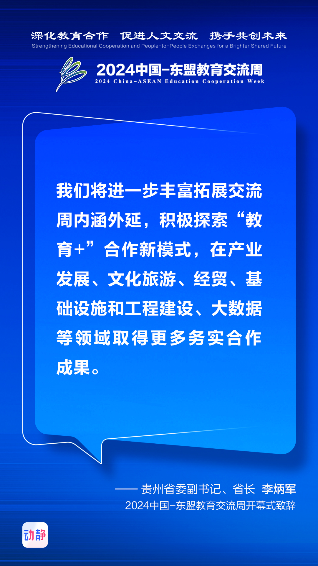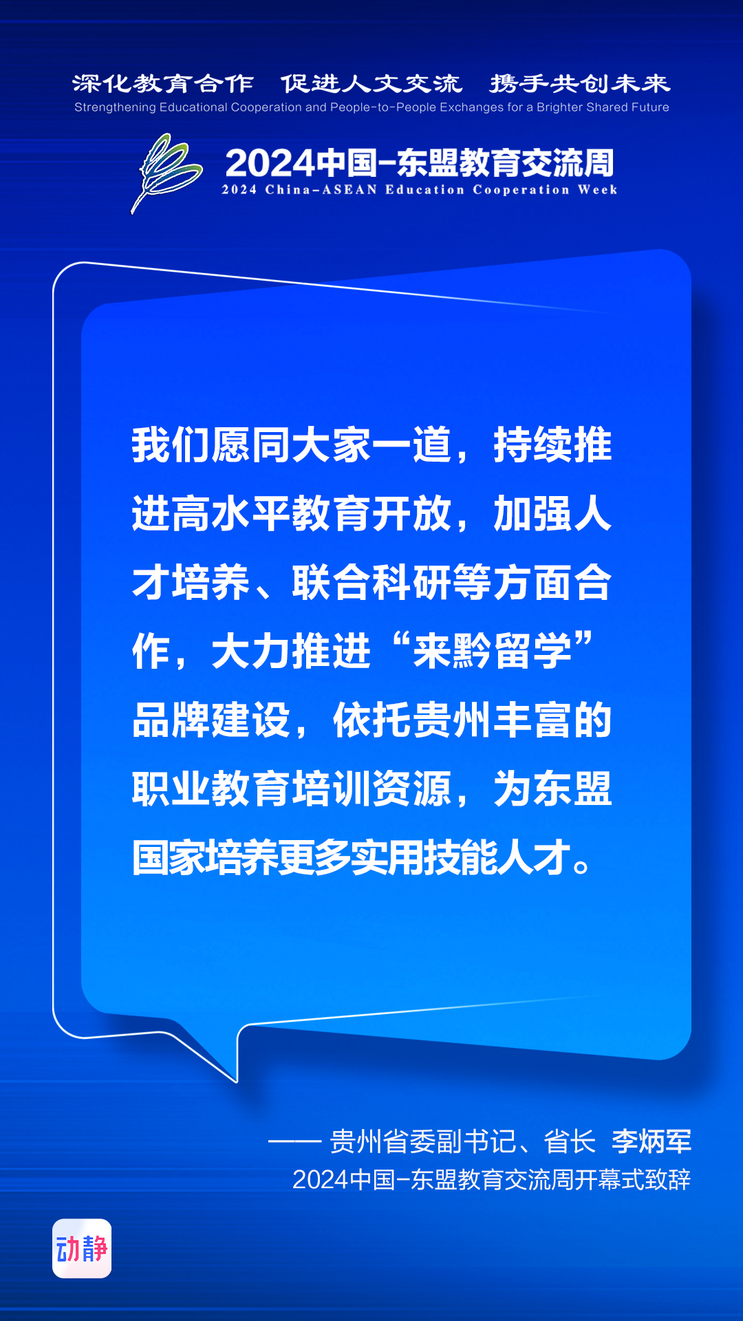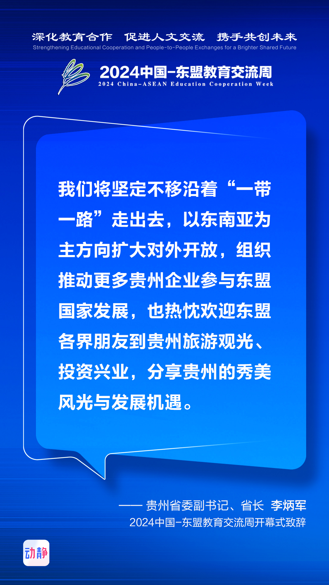 8月21日,由外交部、教育部、贵州省人民政府共同主办的2024中国-东盟教育交流周开幕式在贵阳举行。中共贵州省委副书记、省长李炳军在开幕式上致辞。