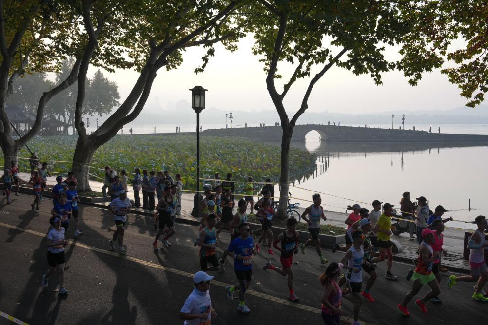 11月2日,参赛选手在比赛中经过西湖景区断桥附近。新华社记者 黄宗治 摄