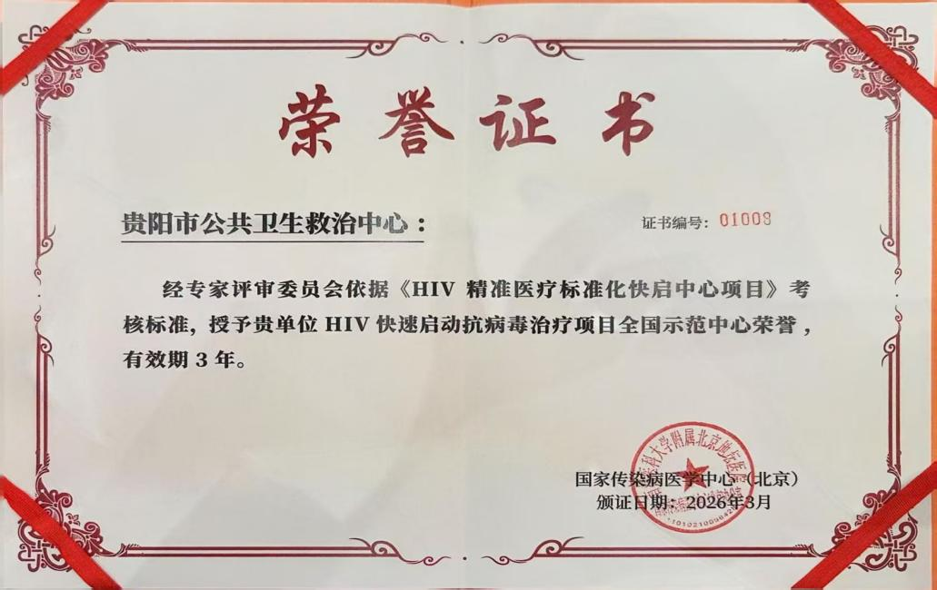 2026年3月,国家传染病医学中心正式向贵阳市公共卫生救治中心颁授“HIV快速启动抗病毒治疗项目全国示范中心”荣誉称号。这份沉甸甸的荣誉,既是对过往工作的肯定,更是对未来发展的期许。