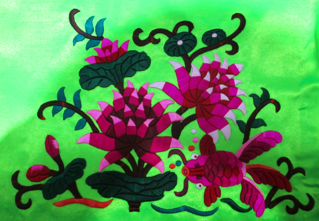 平绣是苗绣中运用最为广泛的技法,绣法简单灵巧,成品光洁平滑,故称平绣。苗族在平绣中融入了很多独特的技巧,大块的画面图案,为了避免平针远用带来的长距造成绣线松散,刺绣时在画面中增加多个断接面,这样能使绣线贴实绣布,绣出花朵色彩的淡浓、动物的脊骨、鱼龙的鳞片、牛的毛色等更具有层次感与观赏性。