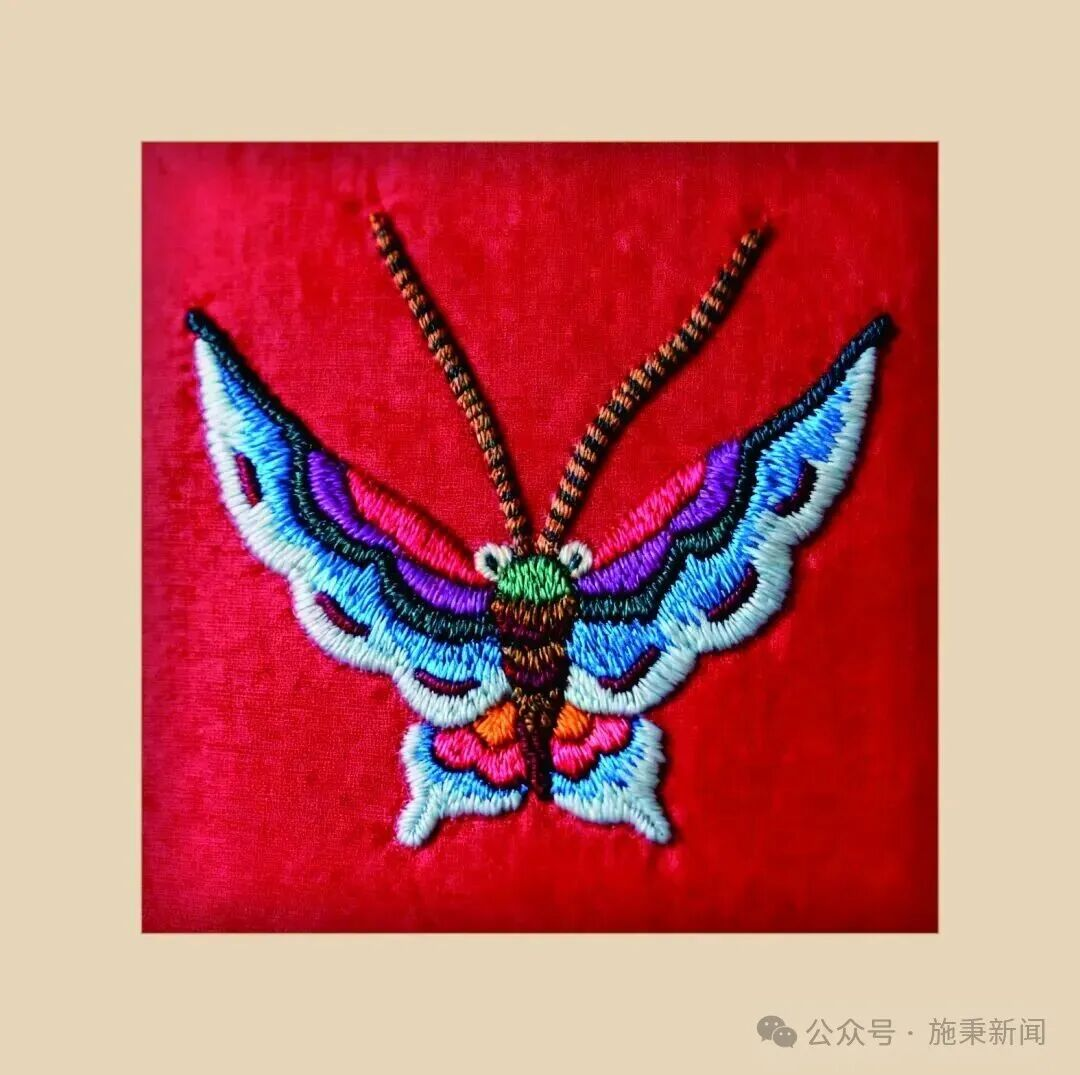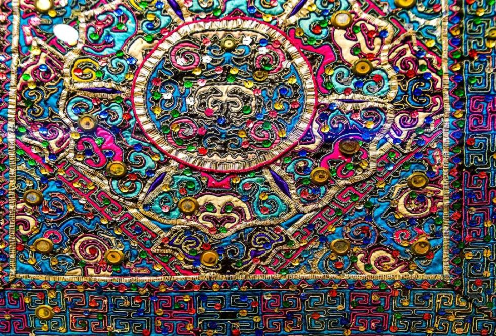 在织金县的苗族聚居地缠绣最为常见,多种颜色的线条可以通过不同的缠绕方式和颜色组合创造出丰富多彩的视觉效果。常用于花朵、几何形状等装饰图案。