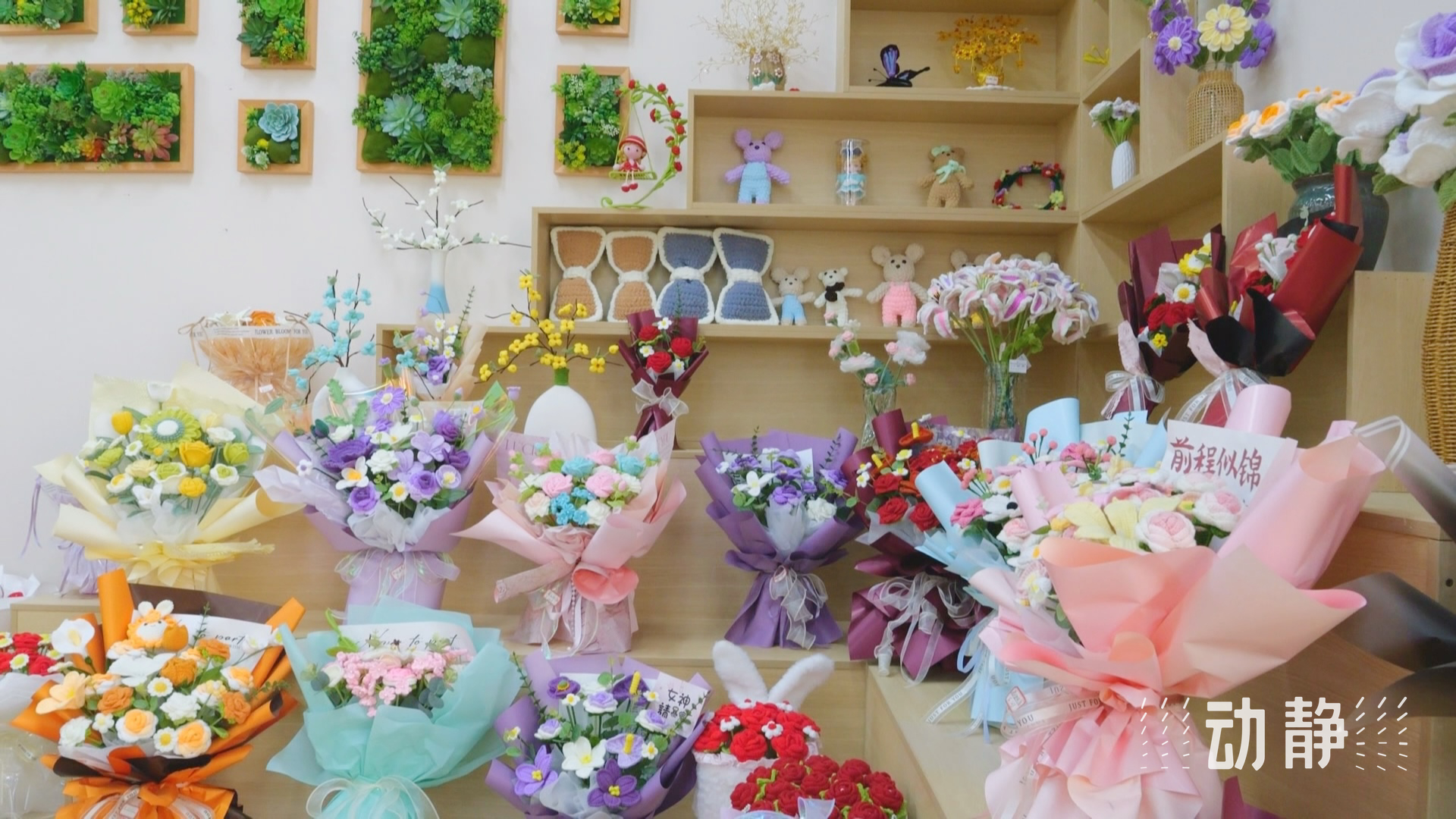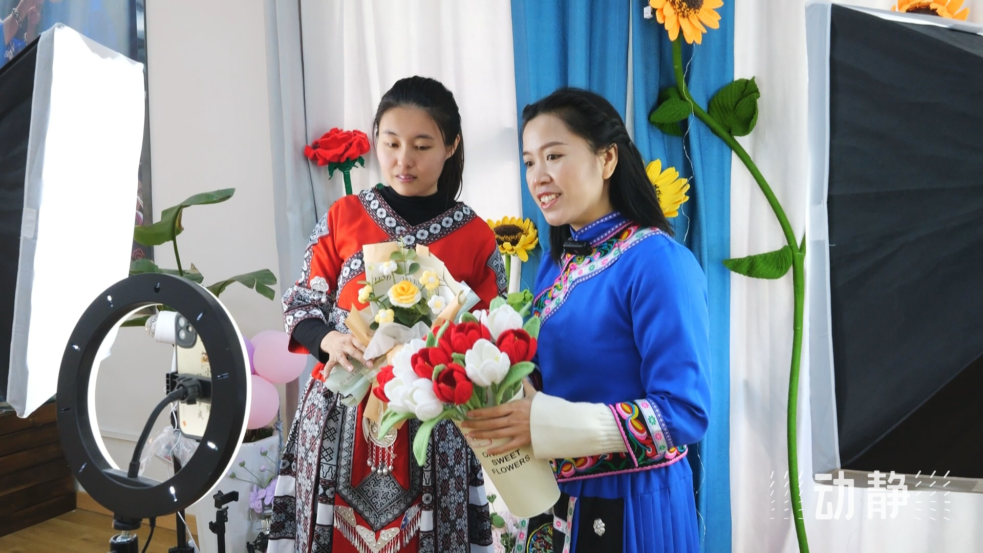 “欢迎来到小美手工直播间,这边全部都是用毛线一针一线钩织出来的……”在天柱县联山街道巾帼创业就业孵化基地,编织队队长陈荣美的直播间里热闹非凡,这段时间,队员们编织的手工花束在网上格外受欢迎。“过年到现在总的800单有了,有些人已经开始订母亲节的康乃馨,还有高考的向日葵,我们最近也在加班加点赶工。”