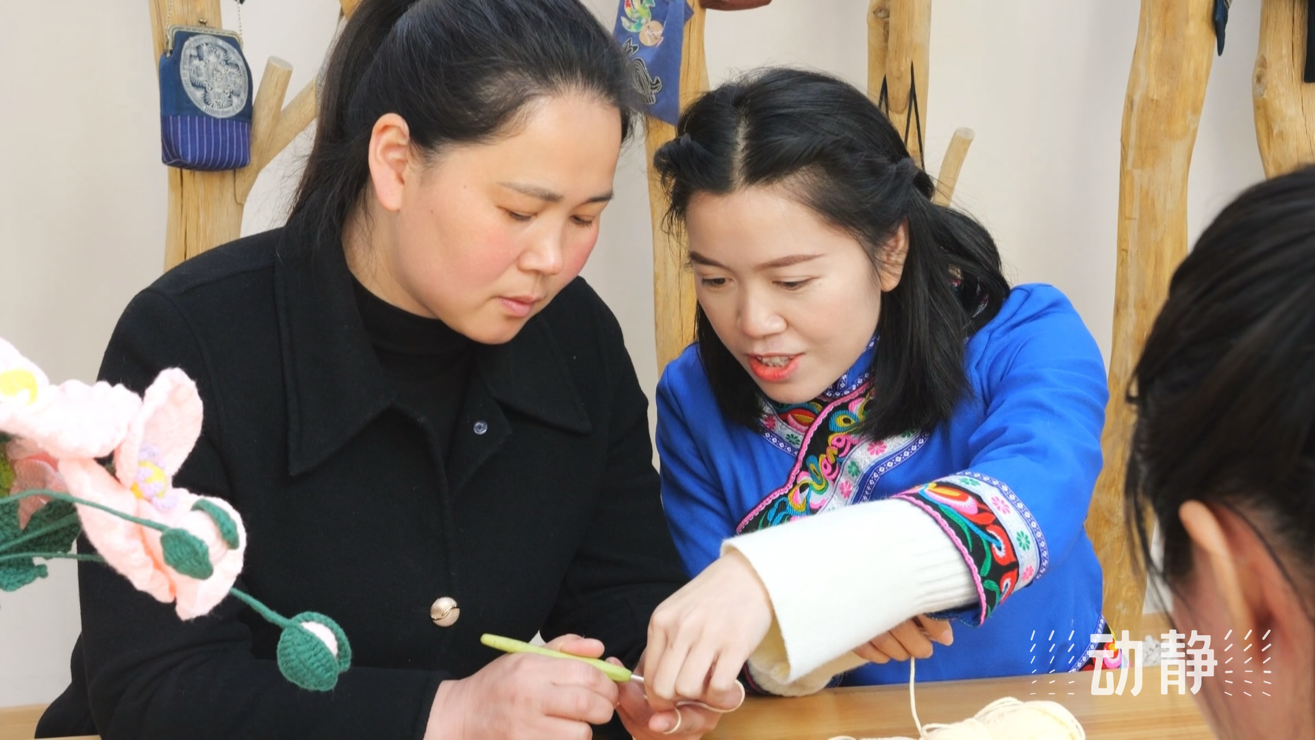 陈荣美说:“很小的时候就跟我妈妈学会了编拖鞋,后来我一边在网上自学钩织一边开直播做视频号。社区书记发现我的手工钩织钩得挺好的,于是鼓励我把搬迁群众也带动一下。现在,每一年都会举行免费培训,从零基础开始,让新手变成熟手。”在陈荣美的努力下,队伍从最初的5个人增加到现在的100多人。