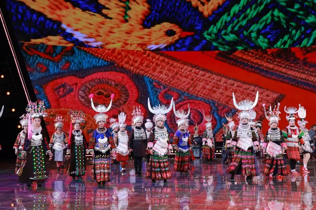 第一篇章:“村”光无限融合侗族大歌、贵州“村画”、阿妹戚托舞蹈等多种“村舞”元素。作为“村晚”开篇,“村”光无限以视觉震撼与编排巧思,瞬间点燃春意。