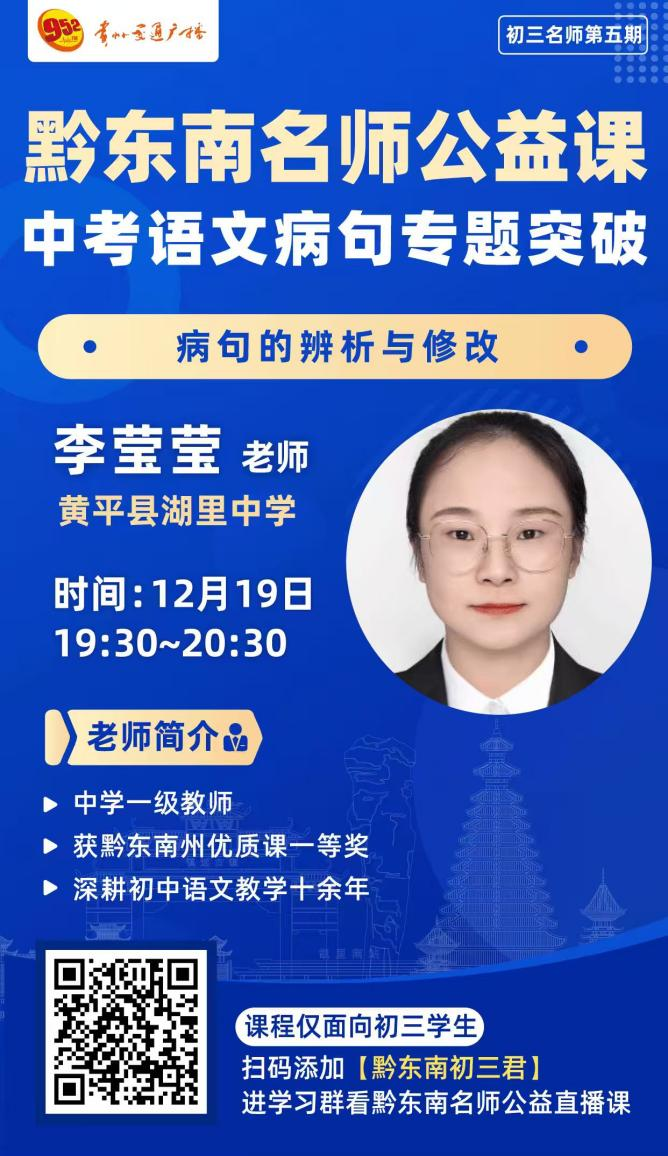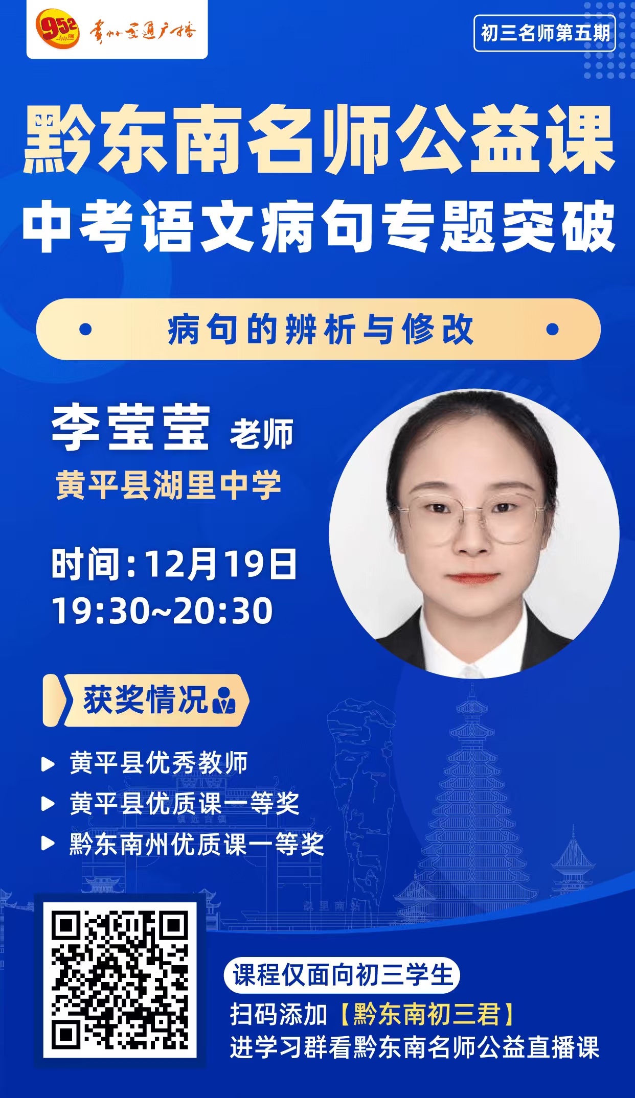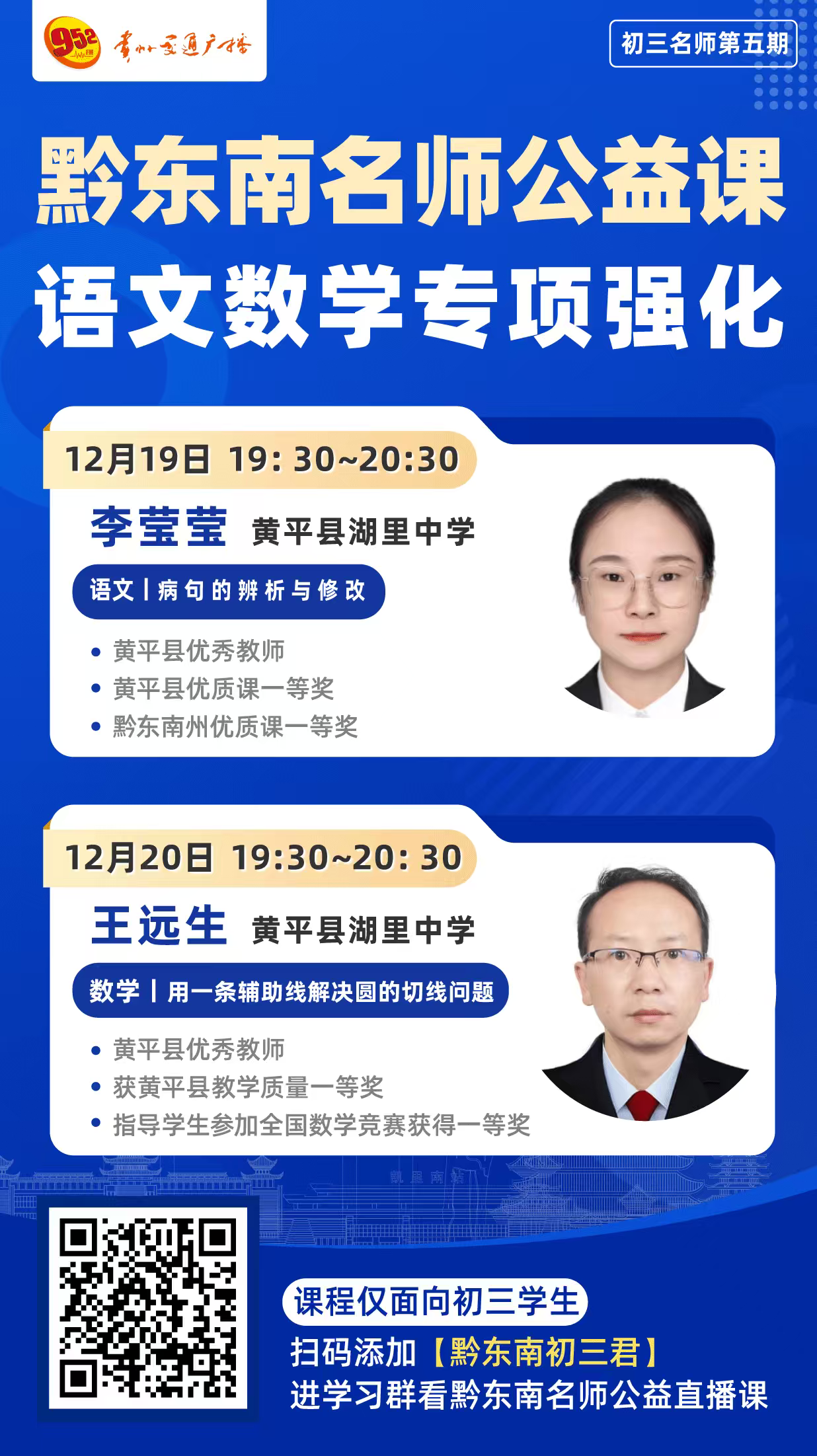 黔东南名师公益课堂(初三名师第五期)重磅开播!本期特邀黄平县湖里中学两位资深名师坐镇,聚焦语文、数学专项强化,直击初三核心考点难点,助力学子精准提分、夯实升学基础!全州初三学子速来锁定直播,跟着名师高效冲刺!