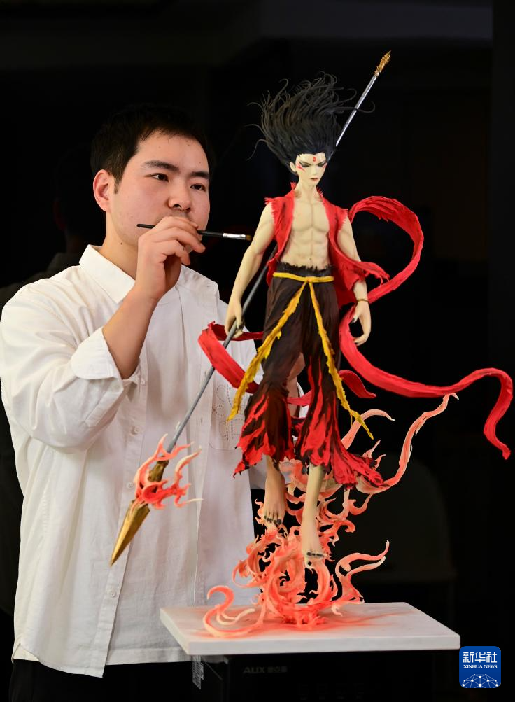 糖艺师张勃在为糖艺作品《哪吒》上色。新华社记者 邹竞一 摄