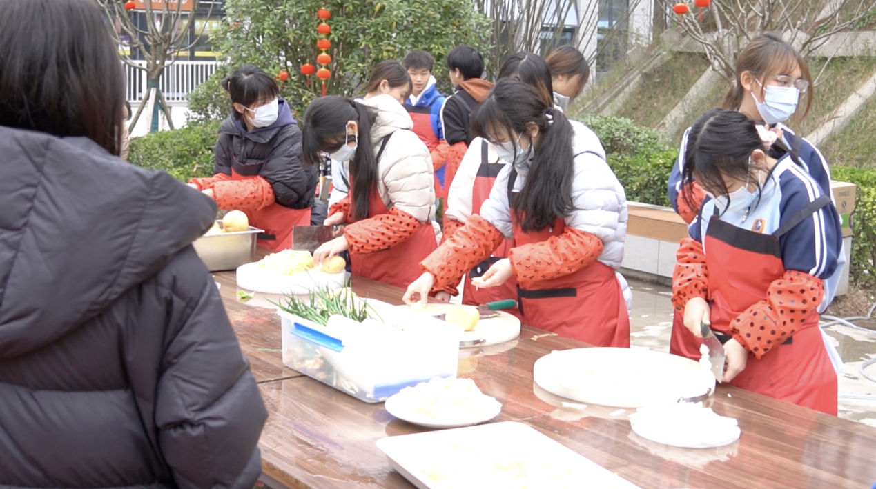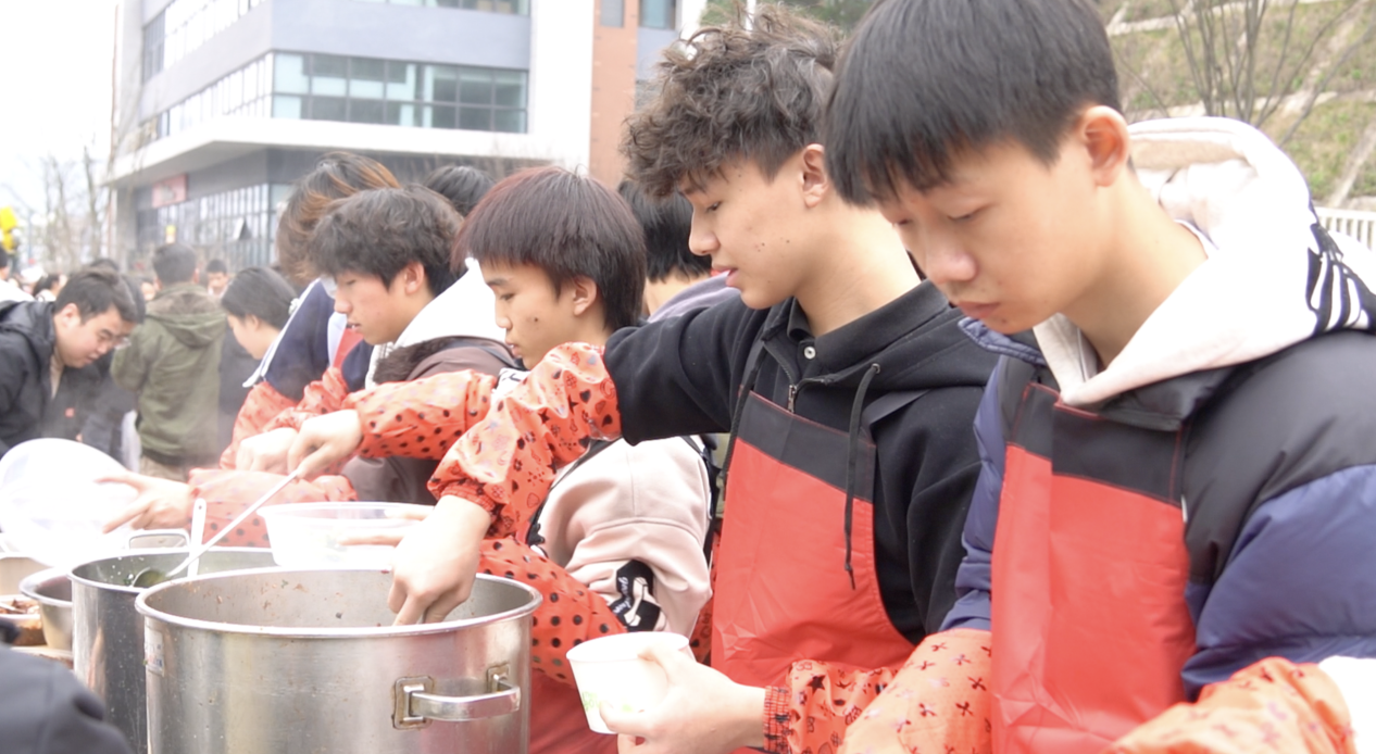 随后的美食制作环节,更成为文化传承的课堂。在师傅的指导下,同学们参与到了以“杀猪饭”为核心的特色年菜制备过程中。从食材处理到烹饪手法,学子们不仅学习了技艺,更深入了解了这些菜肴背后蕴含的贵州饮食文化、家庭观念与新年祈福的寓意。当一道道热气腾腾、香味四溢的酸汤肉片、腊味拼盘、血豆腐等地道黔菜被端上长桌,年的味道、家的温暖也随之弥漫开来。