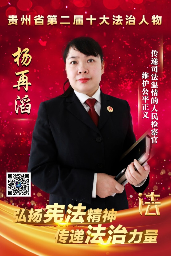 作为一名检察官,杨再滔求极致、办精案、勇担当,努力让人民群众在每一个司法案件中感受到公平正义;作为一名人大代表,她察民情、解民意、汇民智,真诚勇敢地反映人民心声,在立法建议、司法监察等领域发挥着积极作用。