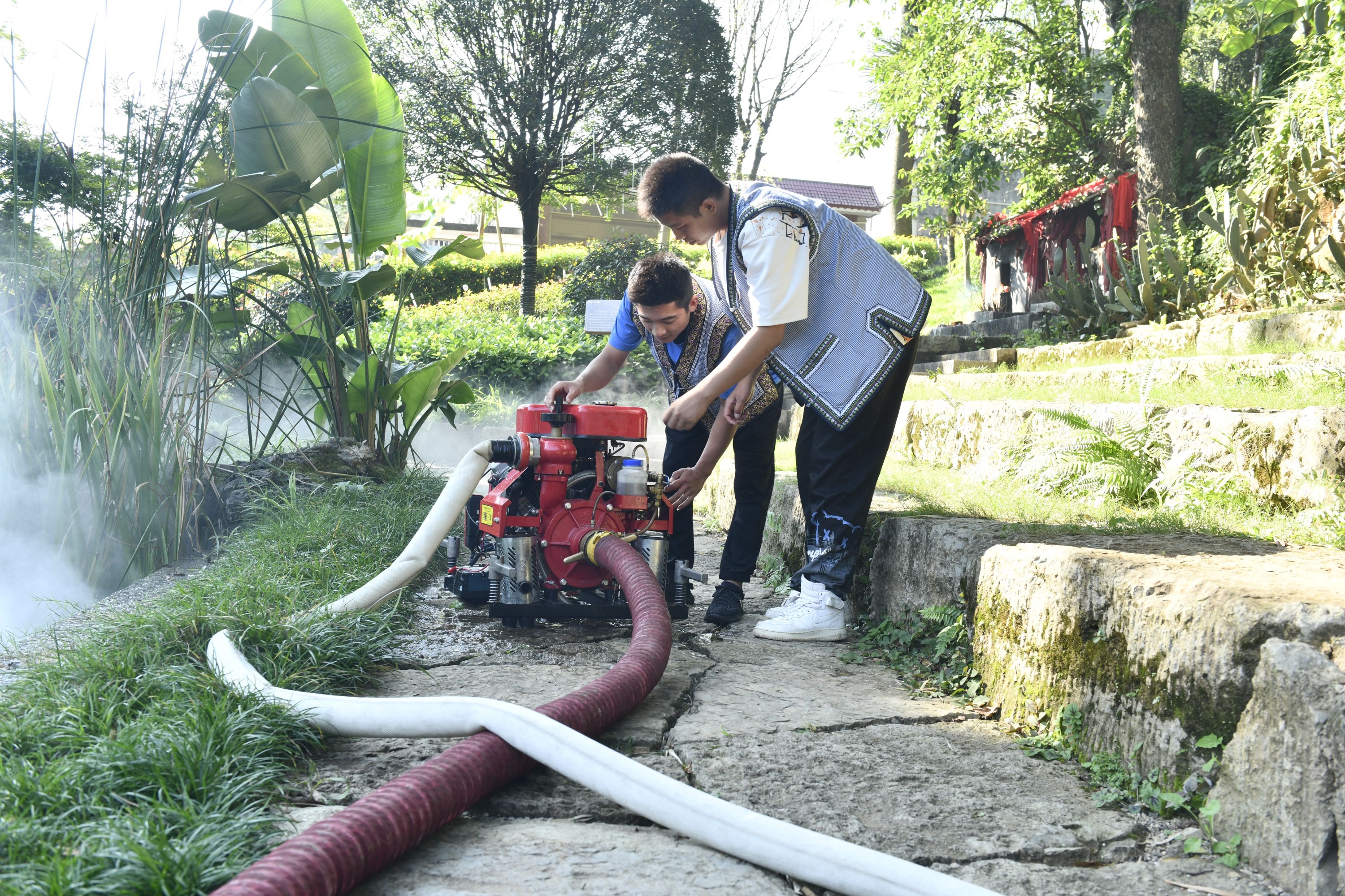 此次演练,假想接待大厅发生火灾,接到警情后,该康养小镇迅速启动消防应急预案,微型消防站队员迅速利用机动消防泵从水池抽水灭火,同时组织被困人员有序疏散。接到报警后,黔西南州消防救援支队和兴义市消防救援大队当天全勤值班人员迅速前往现场,考虑到该场所距离市区较远,室外消火栓不足的特点,紧急调动了兴义市4个消防救援站的远程供水车、抢险救援车、水罐消防车等11辆消防车49人到场,开展灭火和营救人员。