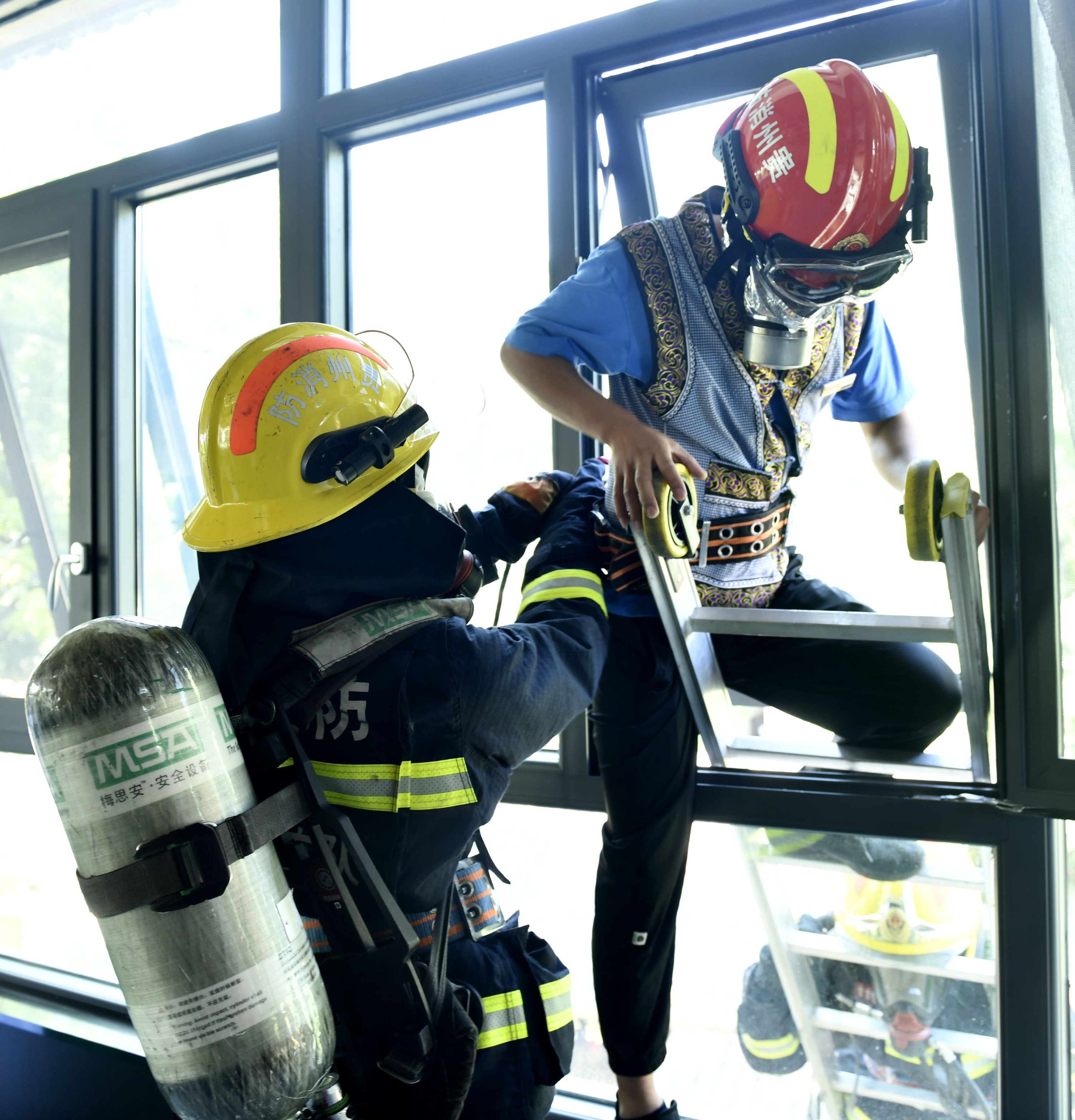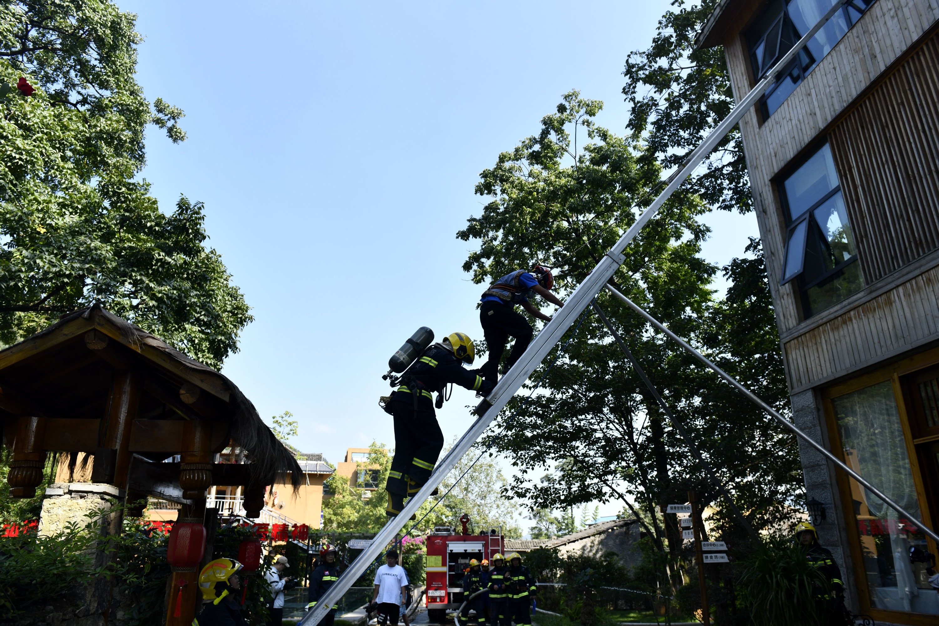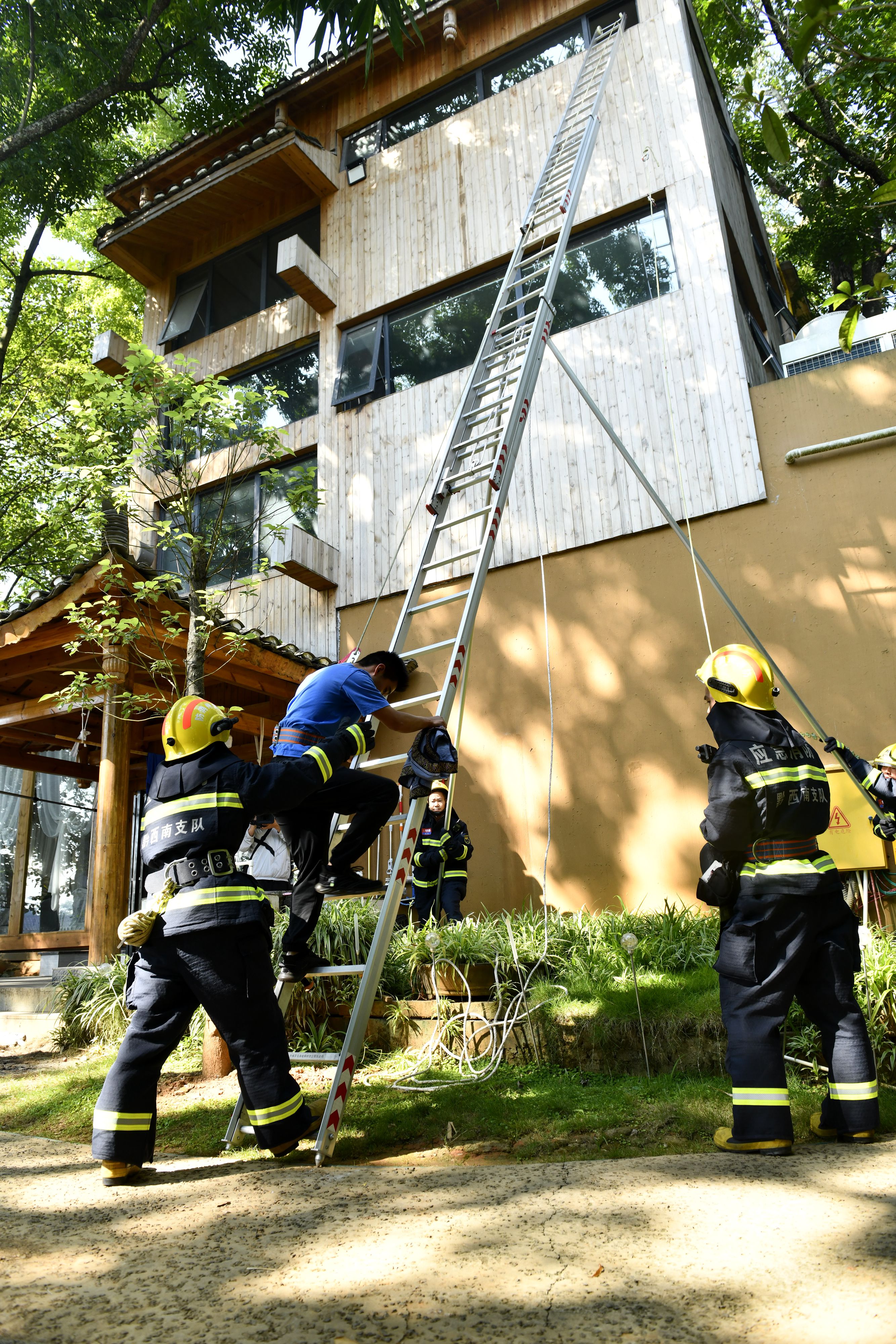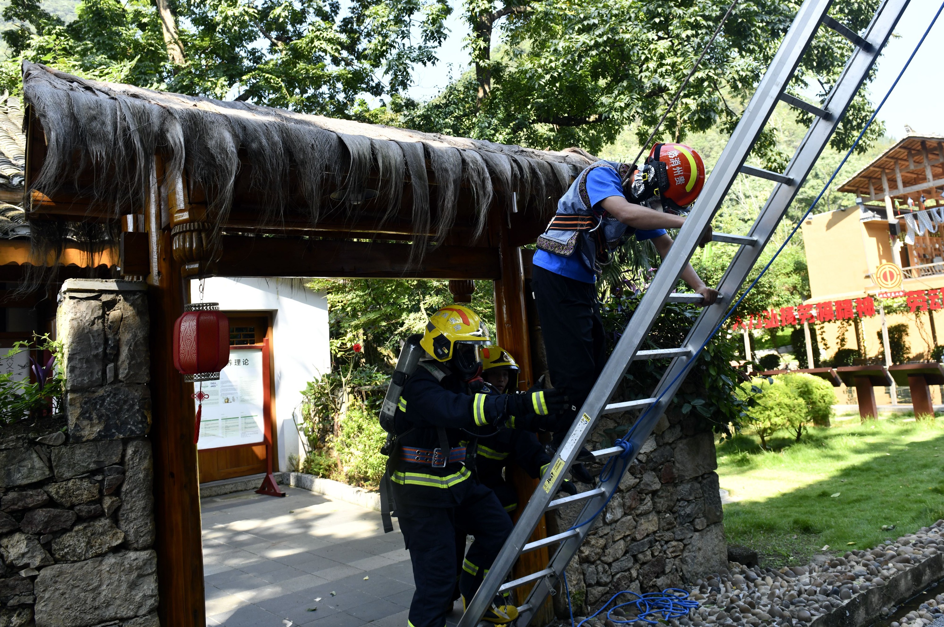在得知楼梯充满大量浓烟有人员被困后,消防救援人员分别从前后两个方向利用三节拉梯架设救人通道,从三楼营救被困群众。着火楼房人员被全部疏散和营救出来后,消防救援人员考虑到相邻楼房可能存在“飞火”风险的情况,又逐一到各楼房疏散客人,完成整个疏散演练任务。
