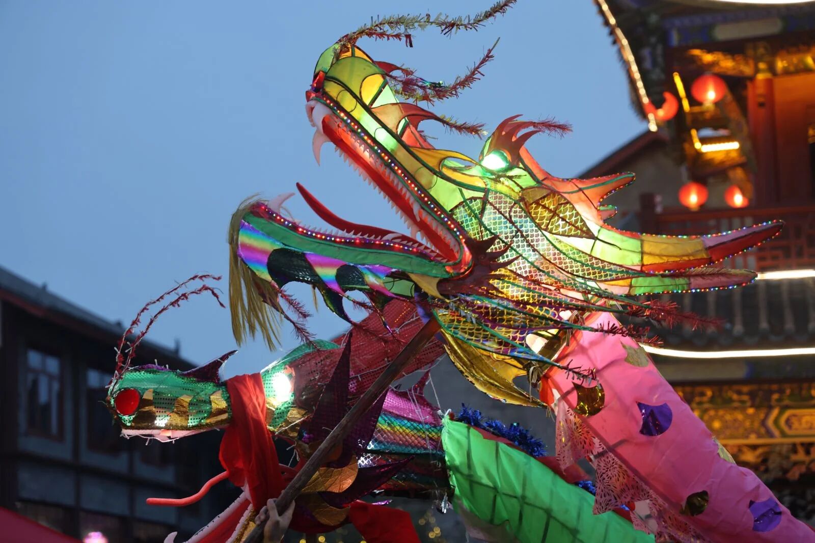 初九开始,我们有一个习俗就是接龙灯,各个街道,各个社区可能都会做自己的龙灯,然后龙灯就会从初九开始,走街串巷。