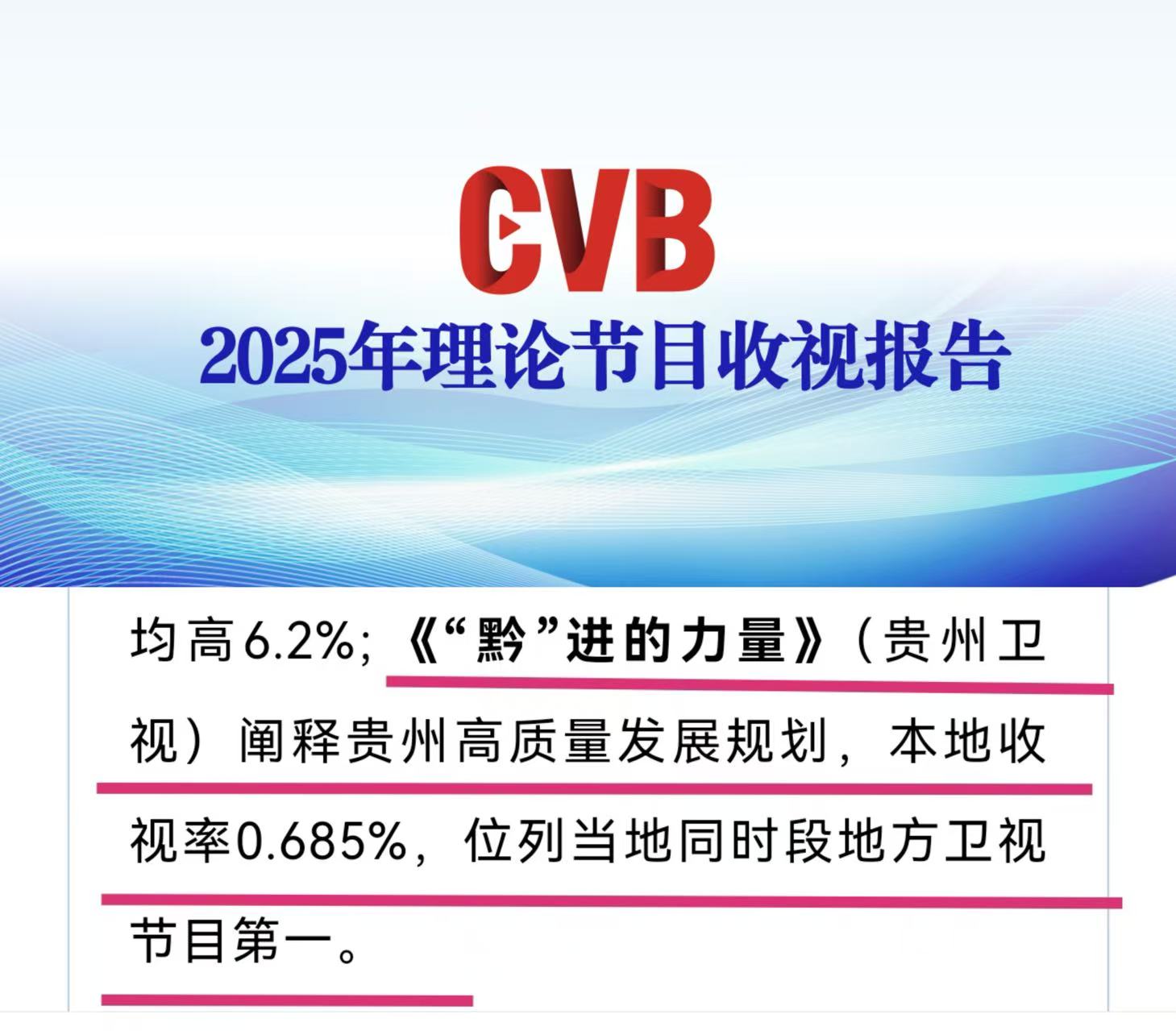 据《中国视听大数据(CVB)2025年理论节目收视报告》统计,2025年全国卫视共播出49档电视理论节目,累计1723期、1086小时,收视突破16亿人次,贵州卫视《“黔”进的力量》阐释贵州高质量发展规划,本地收视率0.685%,位列当地同时段地方卫视节目第一。“CVB”全称为“中国视听大数据”,是广电总局广播电视节目收视综合评价大数据系统的对外发布名称。依托总局节目收视综合评价大数据系统运行,发布客观、真实的视听数据,服务宣传管理、支撑行业发展。