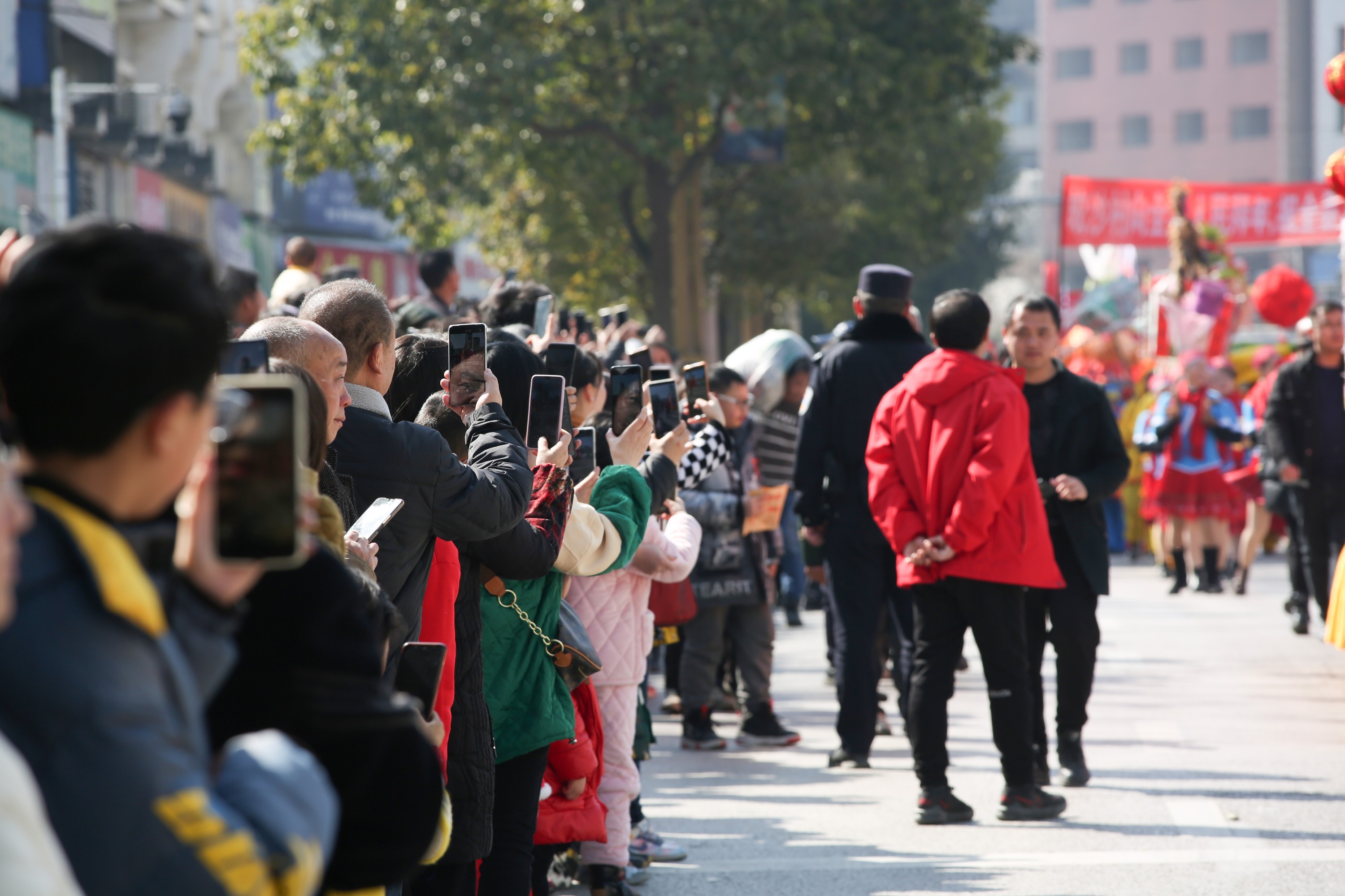 笔者看到,在舞源路、兴隆路、飞云路两边人山人海,围观群众呼朋唤友、携老扶幼,翘首踮足、竞相拍照,有的甚至追逐队伍直到终点。
