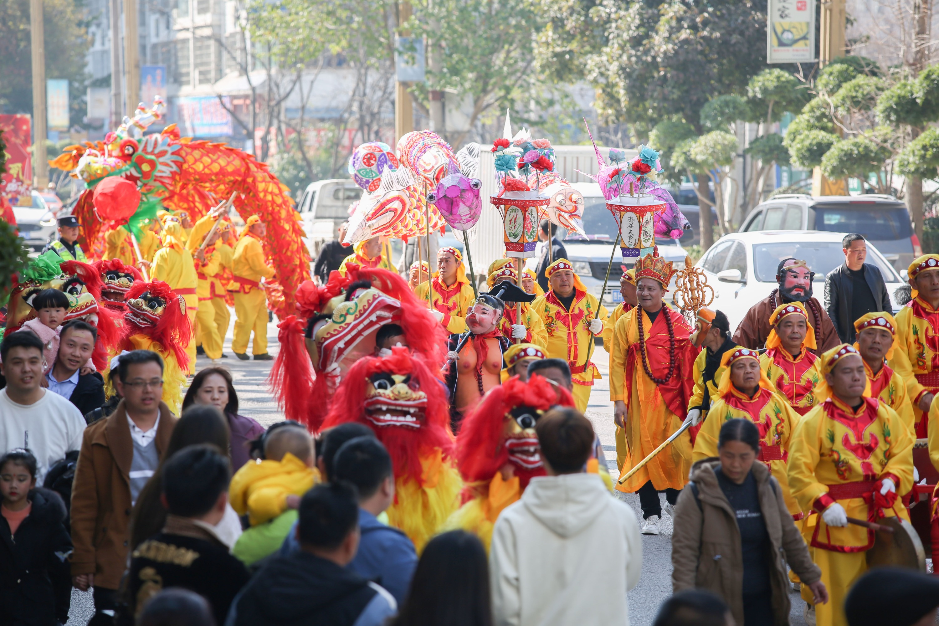 游行现场,乘着短暂空闲,一场“闪现”表演开始,随着密集的锣鼓点声响起,舞龙的人员娴熟的舞动着气势恢宏的大龙翻飞腾动,另一个人手持制作的龙珠左右来回嬉戏,各式各样的花灯簇拥着舞龙前进,还有打扮怪异的花船人员摇着纸船,现场赢得观看者纷纷鼓掌欢笑,用手机、像机、摄影机拍下一个个精彩的镜头和画面。