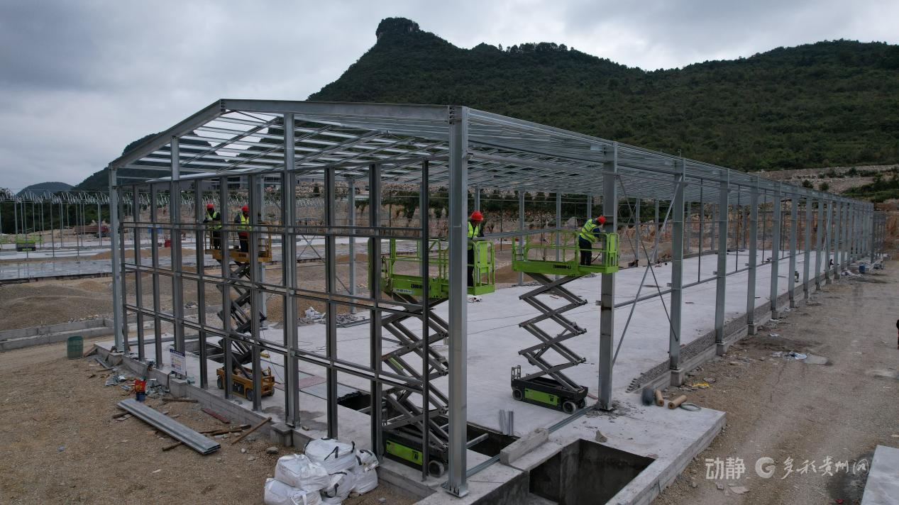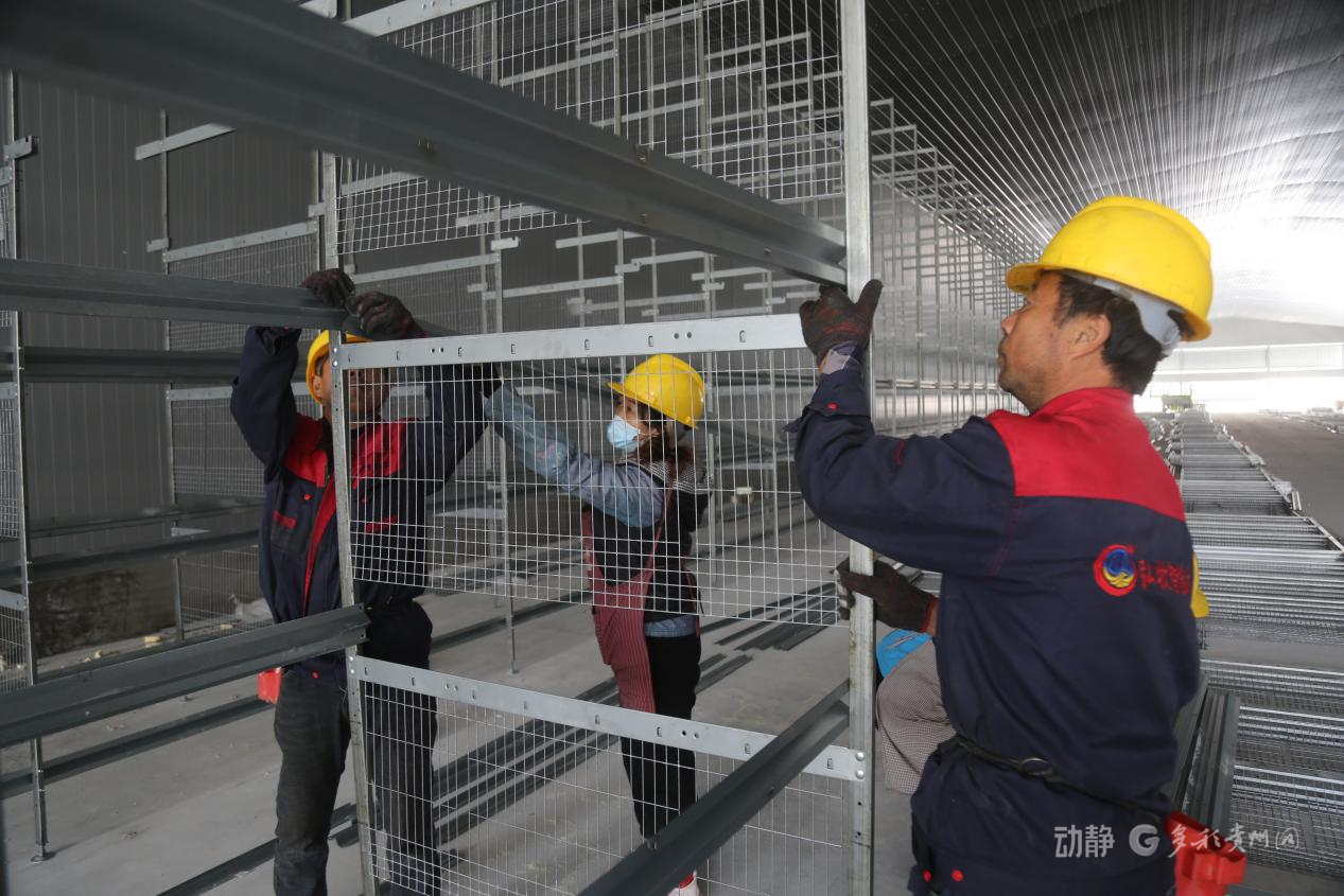 近日,在黔西南州册亨县冗渡镇100万羽蛋鸡项目建设现场,施工方正组织工人搭建鸡舍、安装鸡笼。