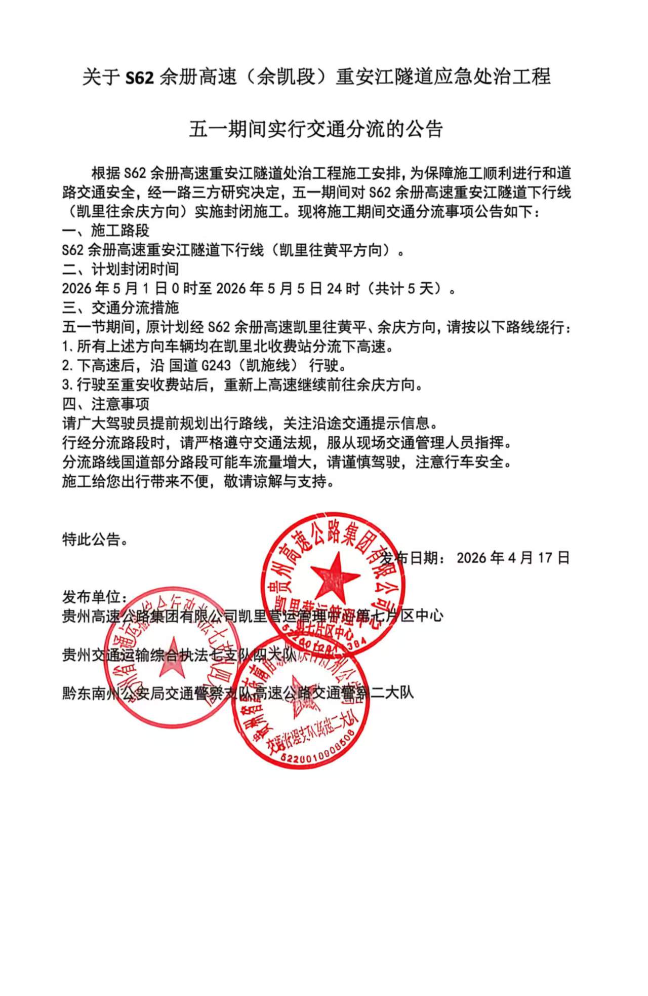 根据S62余册高速重安江隧道处治工程施工安排,为保障施工顺利进行和道路交通安全,经一路三方研究决定,五一期间对S62余册高速重安江隧道下行线(凯里往黄平方向)实施封闭施工。现将施工期间交通分流事项公告如下: