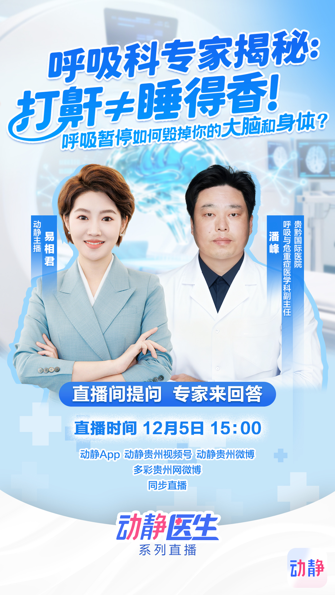 本次直播将系统剖析打鼾与呼吸暂停的真相,从年轻人打鼾的常见诱因,到夜间缺氧如何引发记忆力下降、认知障碍;从呼吸暂停与高血压、糖尿病、心脑血管疾病的关联,到科学应对方法与就医指南。