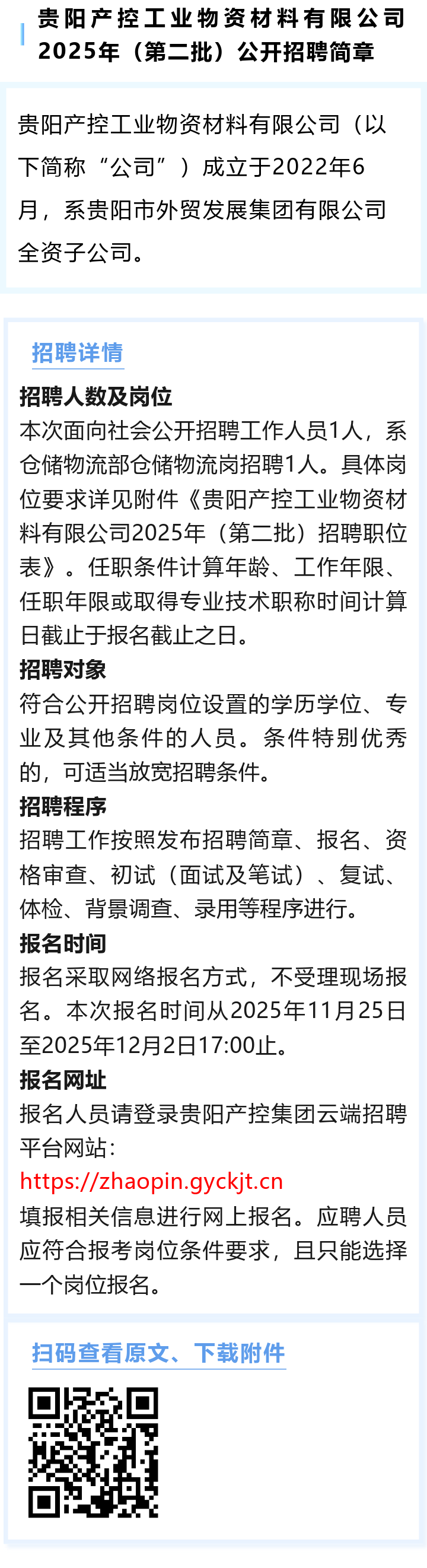 【国企】贵阳产控工业物资材料有限公司招聘!报名截止时间:2025年12月2日!