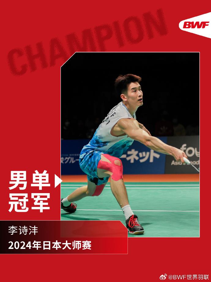 在日本羽毛球大师赛男单决赛中,中国选手李诗沣2比0战胜马来西亚选手梁峻豪夺冠。