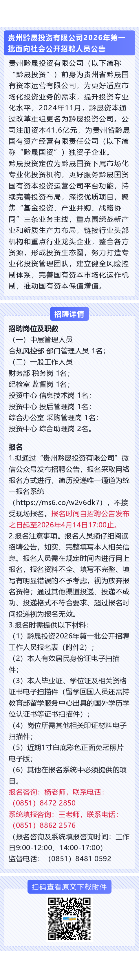 贵州省黔晟国有资产经营有限责任公司子公司招聘!报名截止时间:4月14日!