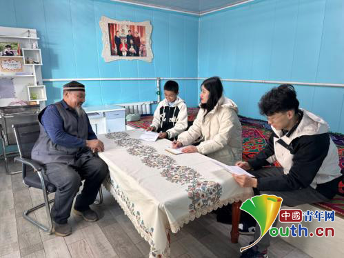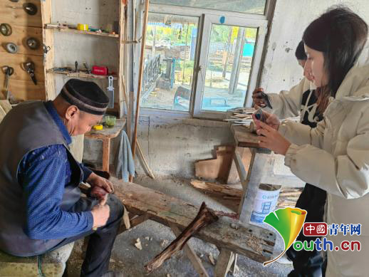 研支团成员与毛皮滑雪板制作技艺传承人斯兰别克·沙和什进行座谈