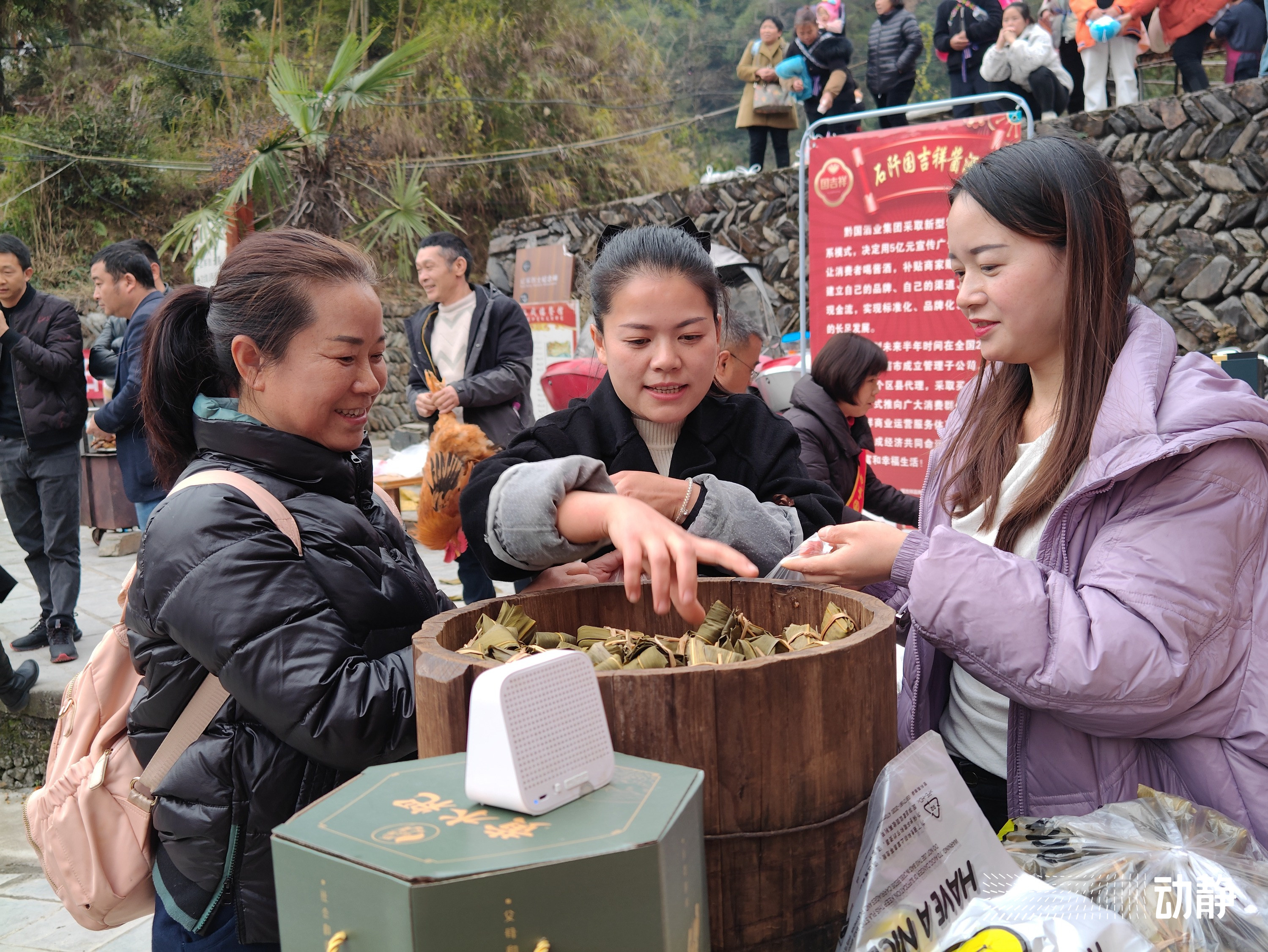 今年敬雀节活动设置了乡愁集市,汇聚了当地小吃黄水粑、神仙豆腐,以及石阡的茶叶、大关酒、绿豆粉等特色产品。